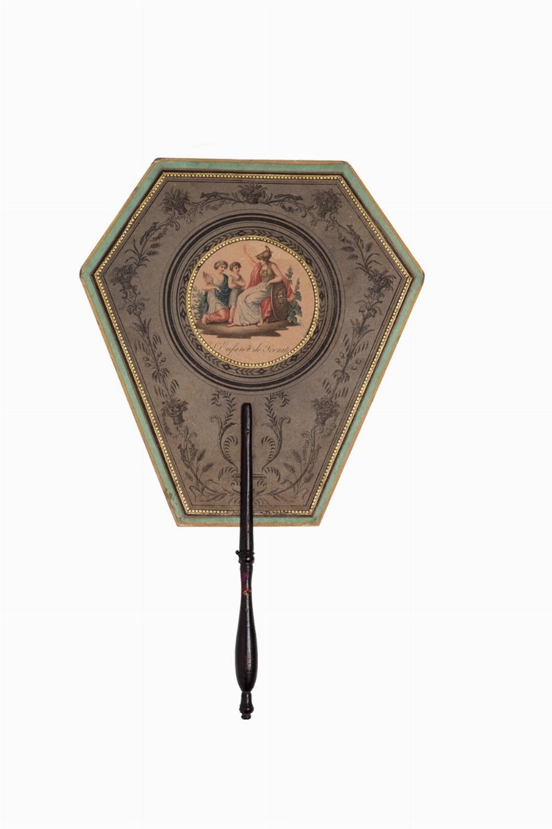 2 ventagli a ventola: uno su cartone 270 x 250 mm, secolo XVIII, al recto applicata un'incisione raffigurante due attori davanti al pubblico e al verso lo spartito di un'"Ariette de Genevotte", intorno delle ceste di fiori e volute dipinte a tempera, fioriture, manico in legno tornito; l'altro su cartone, 230 x 215 mm, fine del secolo XVIII - inizio del secolo XIX, decorato da incisioni sovrapposte, con cornici fitomorfe, al centro del verso un tondo con "L'Enfance de Socrate", al verso un tondo più piccolo con un amorino, 2 sottili cornici in oro, manico in legno tornito parzialmente staccato.