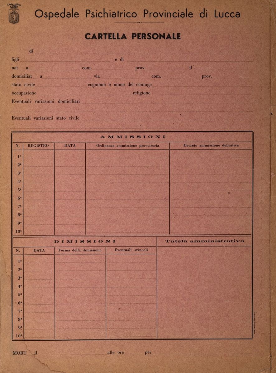Grande cartella dell'Ospedale Psichiatrico Provinciale di Lucca di cartone rosa, con all'interno la poesia "Eri un capitano", firmata da Mario Tobino, datata maggio 1969. All'esterno della carpetta, dedica ad un amico in data 9-5-1969.