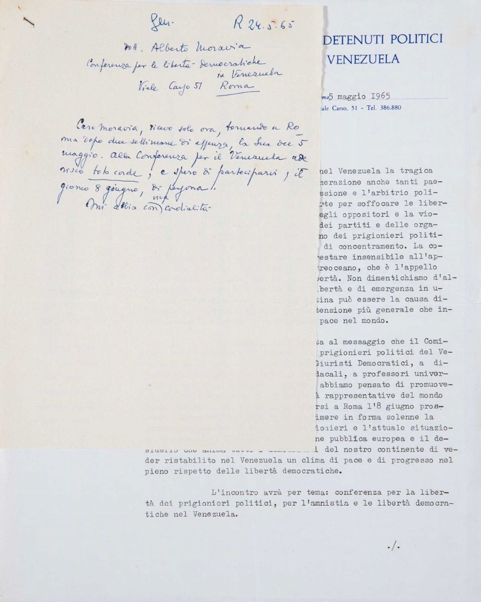 Dattiloscritto di due pagine, con firma prestampata di Alberto Moravia, su carta intestata "Conferenza Europea per l'amnistia dei detenuti politici e per le libertà democratiche in Venezuela", datato 5 maggio 1965.