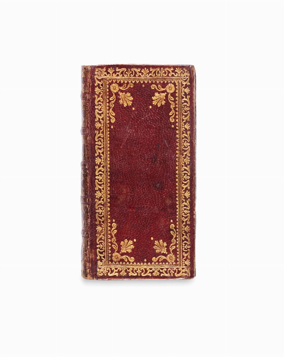 Roma, L. Perego Salvioni, 1795. In 8°.Al frontespizio vignetta calcografica con motto,tavola raffigurante la vera immagine della beata Maria vergine, il tutto inciso da Angelo Campanella, legatura in marocchino marrone con decorazione impressa in oro, ai piatti cornice di motivi floreali ed al centro del campo grande festone, dorso a 5 nervi con ai comparti fregi floreali, tagli dorati. § Nel lotto anche un esemplare de l'Officium hebdomadae sanctae [...], Venezia,N. Pezzana, 1759, in 24°, in graziosa legatura in marocchino marrone con decorazione impressa in oro.