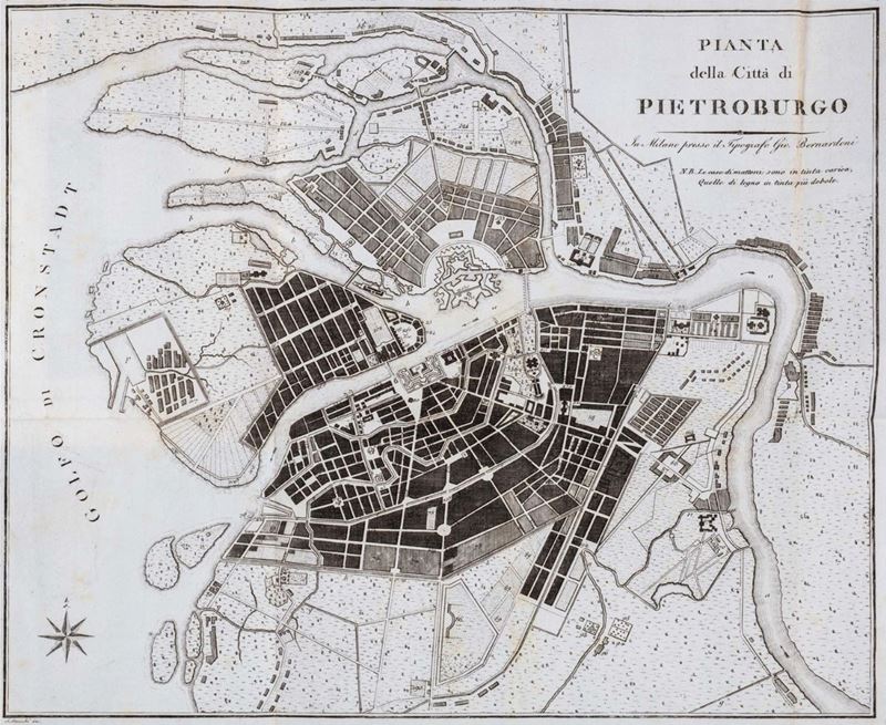Milano, Giovanni Bernardoni, 1815. In 8°. 2 voll. Con 1 carta topografica di San Pietroburgo ripiegata e 8 tavole numerate incise in rame, la maggior parte dei fascicoli in barbe, strappo al margine del frontespizio, alcuni fascicoli leggermente allentati, rare fioriture e piccole macchie, brossura editoriale in carta azzurra con titolo inquadrato da cornice geometrica al centro del piatto anteriore e al dorso, alcune macchie e lievi difetti.