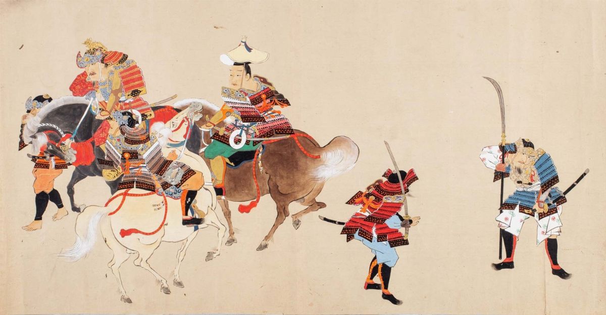 3 dipinti su carta a colori, Scuola Tosa, periodo Edo, raffiguranti dignitari in viaggio, uno dei quali con samurai a cavallo, vari formati da mm.440 x 570 a mm. 440 x 705, strappo restaurato al margine inferiore di un foglio, alcuni difetti.