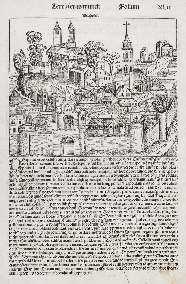 Veduta di fantasia della città di Napoli dal Liber Chronicarum di Hartmann Schedel, di cui costituisce la carta XLII. La veduta con intestazione "Neapolis", benché ritorni nel volume, identica, per altre città, costituisce una delle prime rappresentazioni della città.