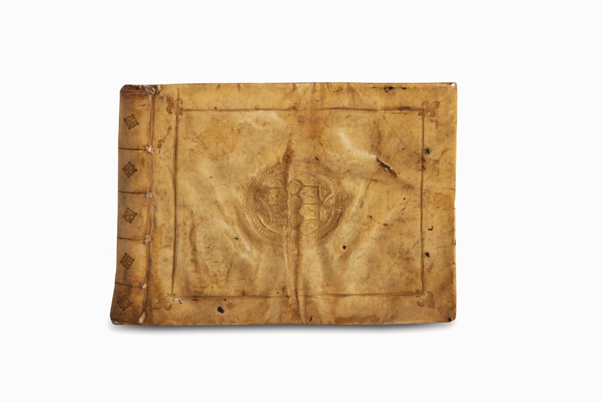 Album in oblungo, mm. 150 x 200, [secolo XVII], composto di 70 carte, di cui 7 con disegni eseguiti a china che raffigurano studi di paesaggi e di cavalieri, legatura coeva in pergamena decorata in oro, al centro del campo elegante placca, ai quattro angoli ferro di giglio, tagli dorati e goffrati, macchiata, rinforzi.