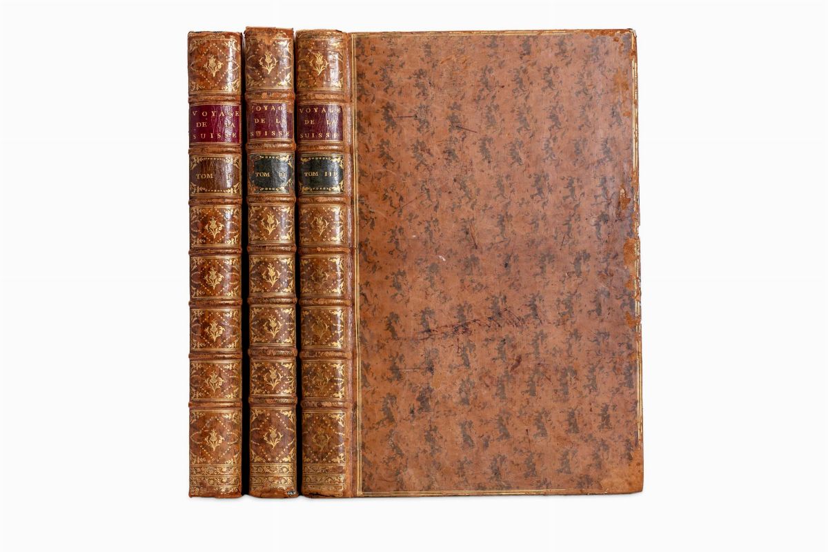Parigi, Imprimerie de Clousier,1780-1788. In 2° grande. 3 voll. Tomo I di testo, con occhietto e frontespizio con stemma reale di Francia, dedica al Conte d'Artois, tomo II con frontespizio e ulteriore frontespizio incisoda Nee su disegno di Lorimierdatato 1785, al tomo III, occhietto, al verso ritratto degli autori entro medaglione, frontespizio incisoda Nee su disegno di Lorimier del 1785 e 60 incisioni numerate dal 218 al 278, fregi xilografici, carte di guardia marmorizzate, leggera brunitura di diverse carte, rare fioriture e piccole macchie, legatura coeva in vitello marmorizzato, piatti inquadrati da cornice di triplice filetto, titolo in oro entro tassello rosso al dorso a 7 nervi, ai comparti fregi fitomorfi impressi in oro, spellature e qualche abrasione, piccole lacune, difetti.