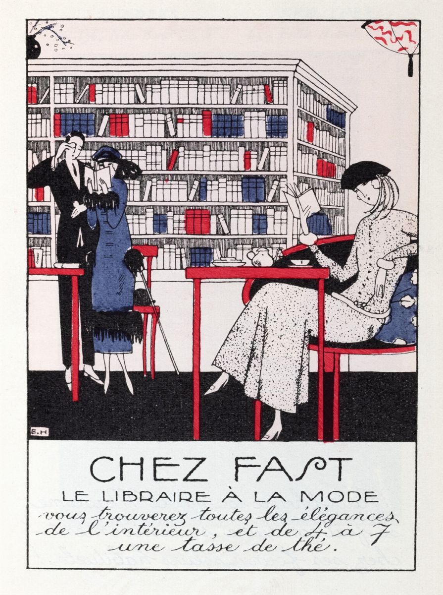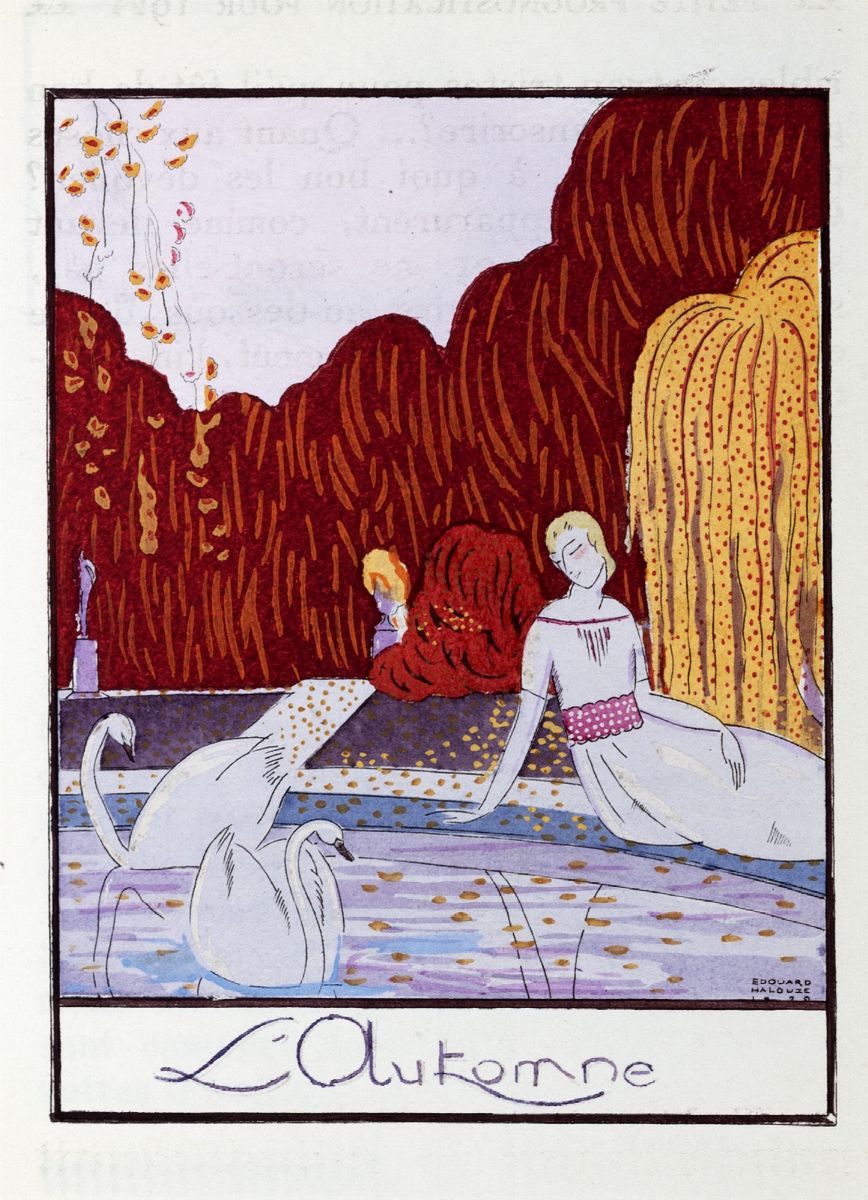 Parigi,Devambez, 1921. in 16°.Vignetta impressa in bistro al titolo, 47 composizioni a colori, di cui 21 a piena pagina , 13 nel testo , 12 cornici per per i calendari, 8 in bianco e nero per i piatti della legatura e 6 nel testo, 17 delle tavole a piena pagina ornano la "Petit Guide de la Vie Elegante”, una raccolta di pubblicità de le Moulin Bleu, Prunier, Gaveau, le libraire Fast, Cartier, les couturiers Raimon et Martial & Arman, legatura originale in cartonato bianco con i piatti illustrati in con figure in silhouette.