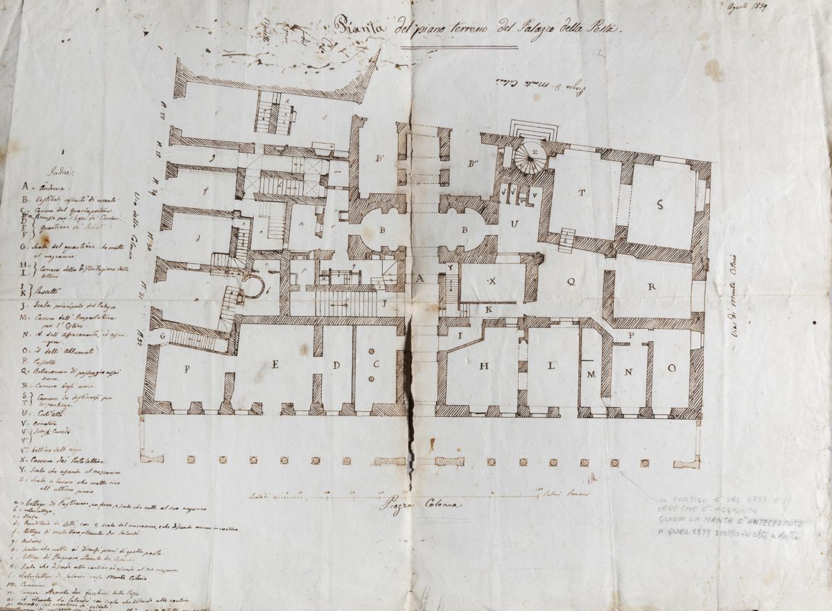 Copia coeva di lettera di Giuseppe Garibaldi ad Anton Giulio Barrili, datata Caprera 24 agosto [s.a., ma 1869] § due stampati del Governo Pontificio invitanti alla sollevazione contro la Repubblica Cisalpina, databili 1797 § Pianta del piano terra di Palazzo Wedekind in Piazza Colonna, Roma, disegnata intorno al 1830.