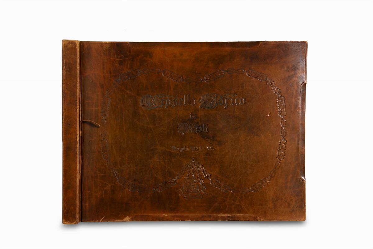 Napoli, s.d.t., [1937]. In 2° oblungo, (m. 470 x 600). Prime 2 carte impresse su pergamena, una con il titolo e l'altra con l'elenco del comitato organizzatore, seguono 38 tavole con stampe vintage alla gelatina sali d'argento in bianco e nero, vari, formati, legatura coeva in vitello marrone decorata con impressioni a secco, al centro del campo titolo entro una catena di forma ovale formata da nodi Savoia alternati da rettangoli con il motto "Fert", al piatto inferiore piatti inquadrati da cornicedi forma poligonale con agli angoli il nodo Savoia ed ai lati il motto "Fert", spellature e qualche mancanza. Al verso del foglio di guardia l'etichetta cartacea del fotografo "GIULIO PARISIO"/Napoli.