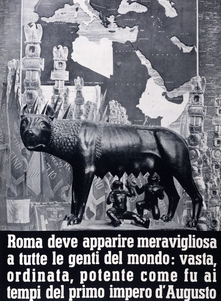 Libro oggetto, edizione speciale della Rivista Illustrata del Popolo d’Italia, elaborato con una grafica d’avanguardia e foto ad altissimo livello artistico. Probabilmente il più esaustivo testo di propaganda dell'era fascista che, muovendo dalla storia romana, illustra ed esalta le imprese coloniali, le opere di bonifica e le realizzazioni infrastrutturali, la finanza e le industrie del tempo. Frutto di una pluralità di contributi (tra gli altri di A. Solmi, R. Almagià , A. Starace, M. Appelius, A. Lessona, G. Agnelli, V. Azzolini, G. Paolucci Di Calboli) e di una impaginazione e di una grafica di grande impatto visivo curata da M. Luigi Poli con contributi artistici di B. Buffoni, E. Carboni, P. Garretto, R. Micaelles, M. Nizzoli e M. Sironi e con le fotografie di S. Bricarelli, F. Patellani, L. Ridenti e B. Stefani.