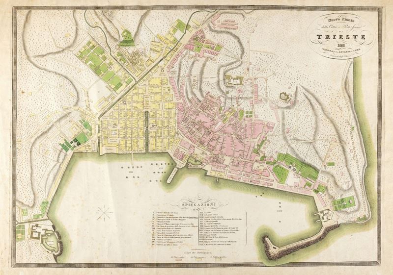 Non comune pianta di Trieste con le varie parti della città distinte in colori diversi.