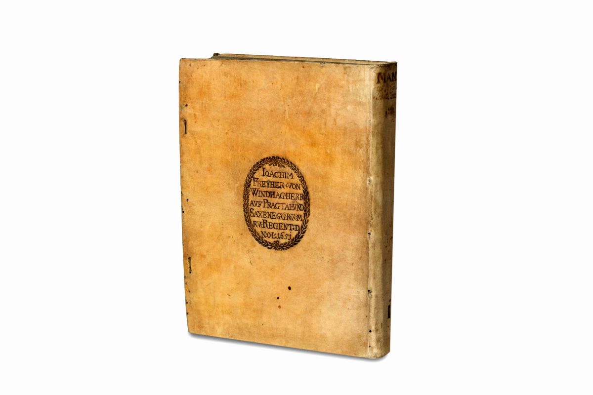 Ingolstadt, G. Hanlin, 1652 - 1651. In 4°. 2 parti i n vol. (la seconda parte inizia a c. 2Er, con proprio front. datato 1651: Pars 2. Tractatus rationalis de tutoribus et curatoribus. Qualche fregio tipografico, fioriture sparse, legatura in pergamena coeva, al centro del piatto anteriore stemma nobiliare impresso in nero, al piatto inferiore ovale con l'scrizione " Freyher von / Windhag Herr / auf Pragtal und / Saxeneggr. K. M. R. / v: Regent. D.N. / O.L. 1651", tagli azzurri, qualche macchia e piccoli fori di tarlo. Al frontespizio firma di appartenenza.