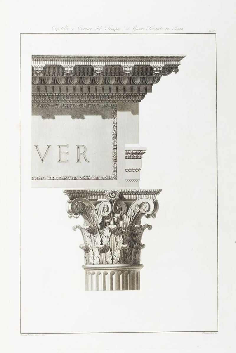 Interessante opera illustrata con 39 tavole incise in rame, dedicate al Tempio di Antonino e Faustina, Tempio detto della Sibilla in Tivoli, Tempio detto di Vesta in Roma, Tempio di Giove Statore, Tempio di Giove tonante, e Teatro di Marcello.