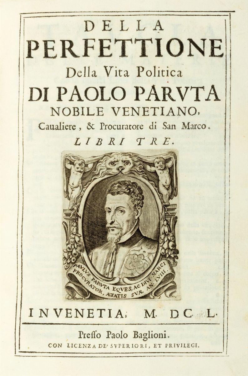 Venezia, Paolo Baglioni, 1650. In 4°. 2 parti in 1 vol. Occhietto, ritratto dell'autore inciso in legno al frontespizio, fregi e iniziali xilografici, alcune carte con lieve brunitura, lavoro di tarlo all'occhietto, leggere macchie alle prime carte. Nota di possesso cancellata al frontespizio § Legato con Paruta, Paolo, Della Perfettione della vita politica, Venezia, Paolo Baglioni, 1650. Ritratto dell'autore al frontespizio, alcune carte con leggera brunitura, legatura coeva in pergamena, titolo manoscritto su tassello cartaceo al dorso, piccola mancanza all'angolo superiore, restauro al dorso, alcune leggere macchie. § Paruta, Paolo, Historia Venetiana, Venezia, Domenico Nicolini, 1605. In 4°.