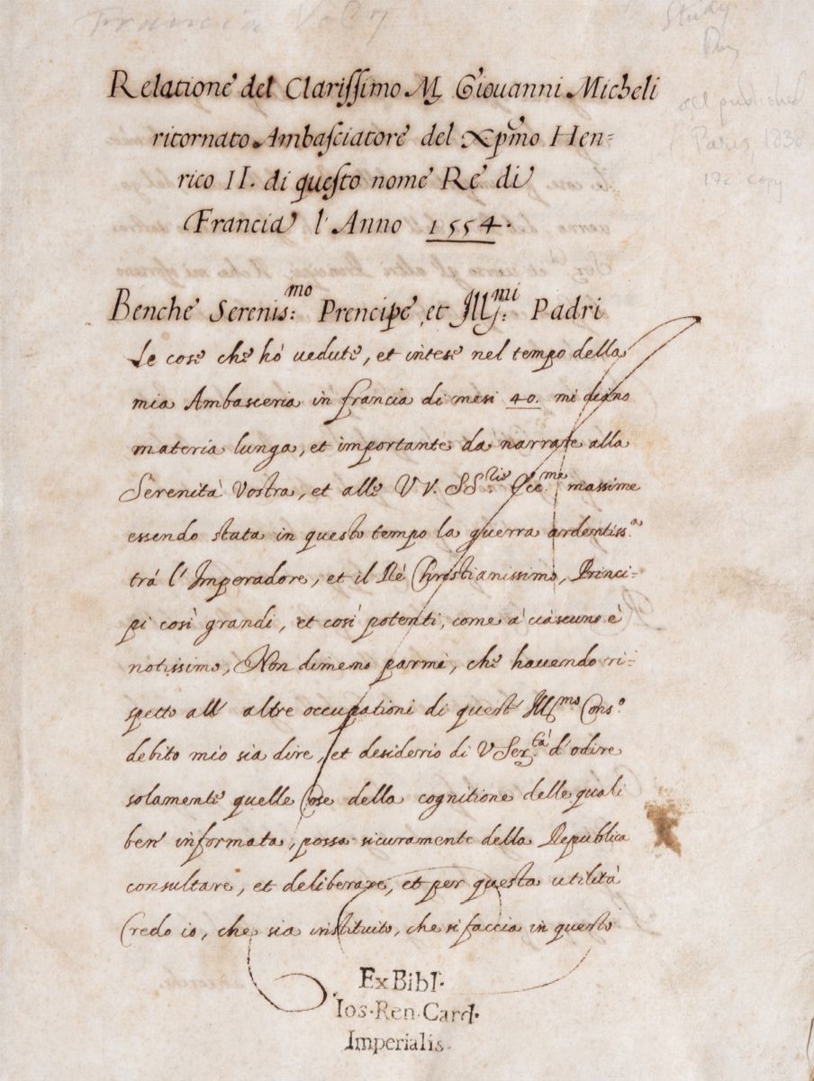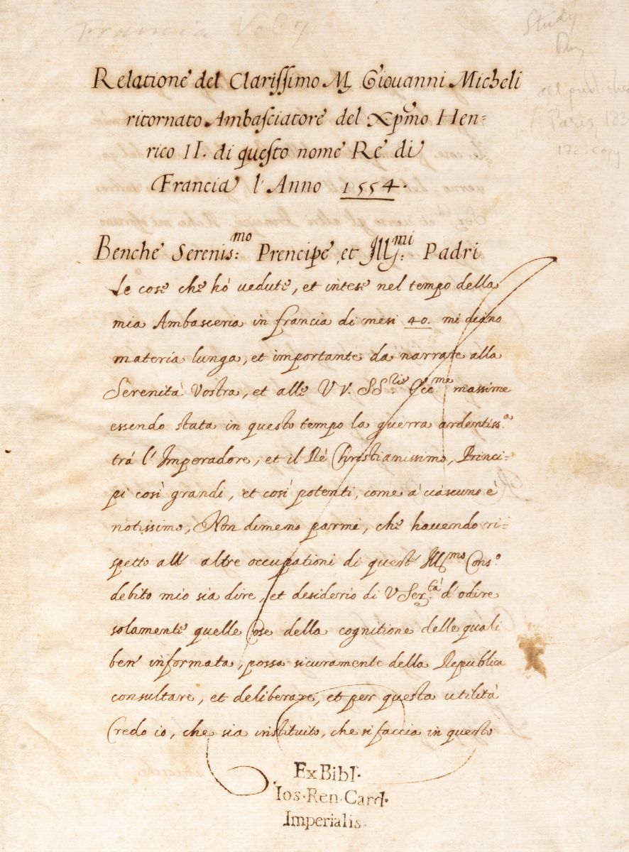 Relatione del clarisimo M.Giovanni Micheli ritornato ambasciatore - Relatione del Clarissimo M.Gio: Correr nel ritorno di Francia l'anno 1570, 1650