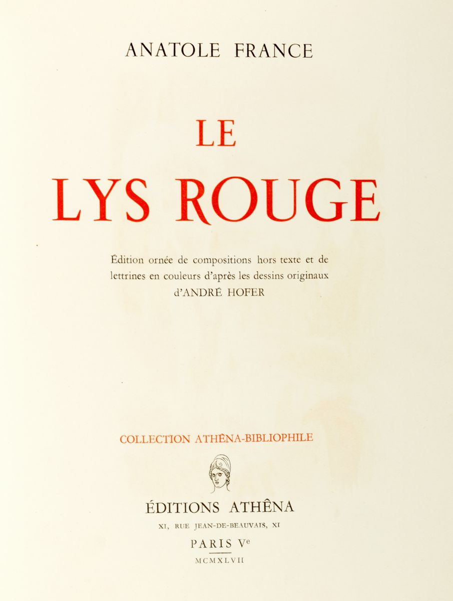 Roma, Edizioni Astrea, 1945. In 4°. Con 17 disegni a colori a piena pagina e 28 tra finalini e testatine incisi da Orfeo Tamburi, pochi piccoli fori di tarlo alle prime carte, brossura editoriale in cartoncino con piatto anteriore illustrato a colori, qualche foro di tarlo, dorso mancante, leggera brunitura, qualche lieve alone. § Insieme nel lotto France, Anatole; Hofer, André; Le Lys Rouge, Parigi, Editions Athêna,1947. In 4°. Con 10 tavole a colori di André Hofer, numerose testatine monocrome, testo inquadrato da cornice tipografica rossa, fascicoli sciolti entro brossura e cartellina editoriale, custodia in cartoncino, lievi difetti.