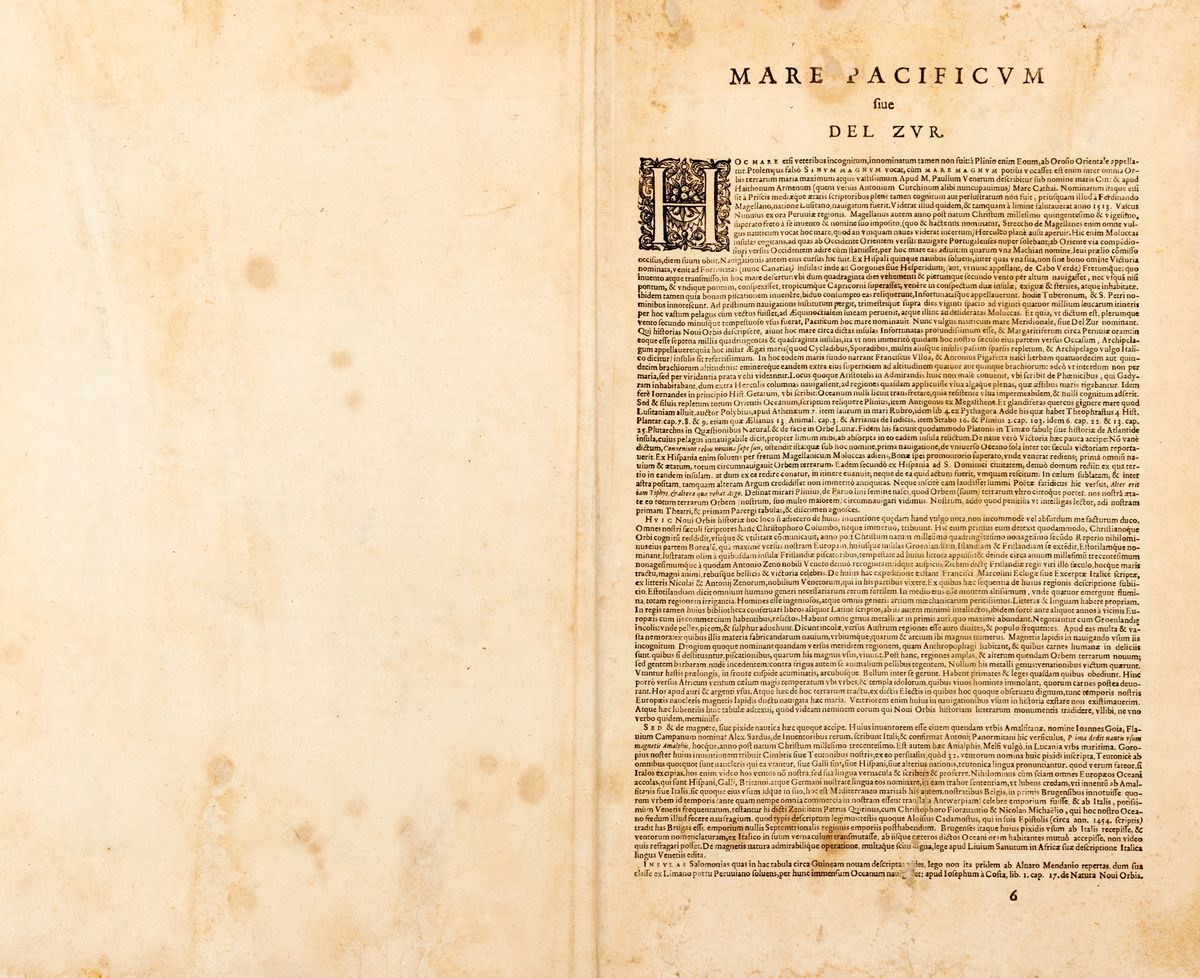 Incisione su rame, [1595], mm. 565 x 460 il foglio, con 2 cartigli, uno con la data del 1589, due galeoni, nella zona mare, con la descrizione dettagliata della Victoria , la nave Ammiraglia di Magellano, al verso testo in latino, restauri e lacune in risarcite.