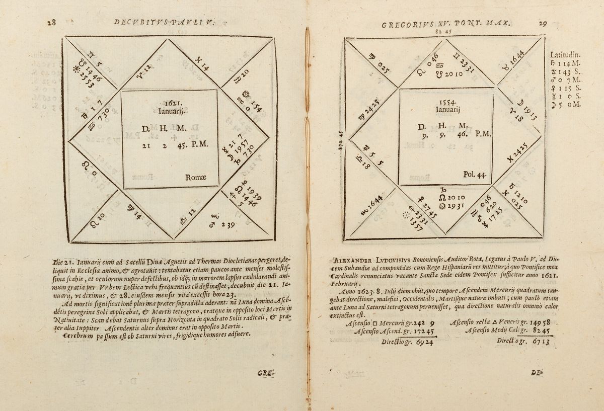 Prima edizione dell'opera più importante di Argoli, professore di matematica a Roma e poi a Padova. Il secondo tomo, tratta di "malati eccellenti" e si compone di 126 diagrammi astrologici di forma quadrata. L'opera è interessante perché contiene una delle prime attestazioni e citazioni della scoperta della circolazione del sangue fatta da Harvey nel 1628.Caillet, 8365.