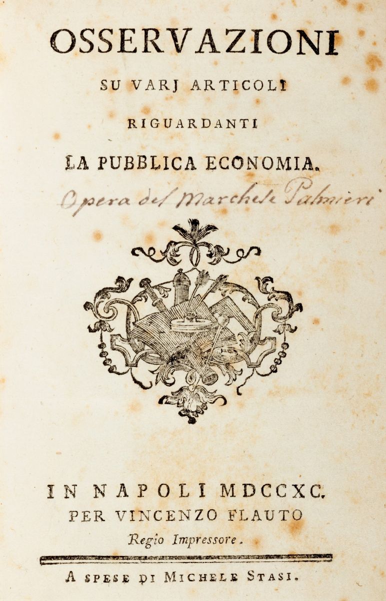 Venezia, Antonio Graziosi, 1767. In 4°. Marca calcografica al frontespizio con Giustizia e Pace abbracciate e il motto Iustitia et Pax osculatæ sunt, fregi e iniziali incisi in legno, in fine al testo il fascicolo sciolto Parte presa nel Serenissimo Consiglio in materia de’ beni Ad pias causas. S. l. [Venezia], Figliuoli Z. Antonio Pinelli, 1767, legatura coeva in cartonato, titolo manoscritto al dorso. § Palmieri, Giuseppe, Osservazioni su varj articoli riguardanti la pubblica economia, Napoli, Vincenzo Flauto, 1790. In 8°. § Dodsley Robert, Economia della vita umana, Napoli, Castello Longobardo, 1777. In 8°. Fioriture leggere, alcuni fori di tarlo restaurati, legatura coeva in pergamena, titolo in oro entro tassello rosso al dorso, lievi difetti.
