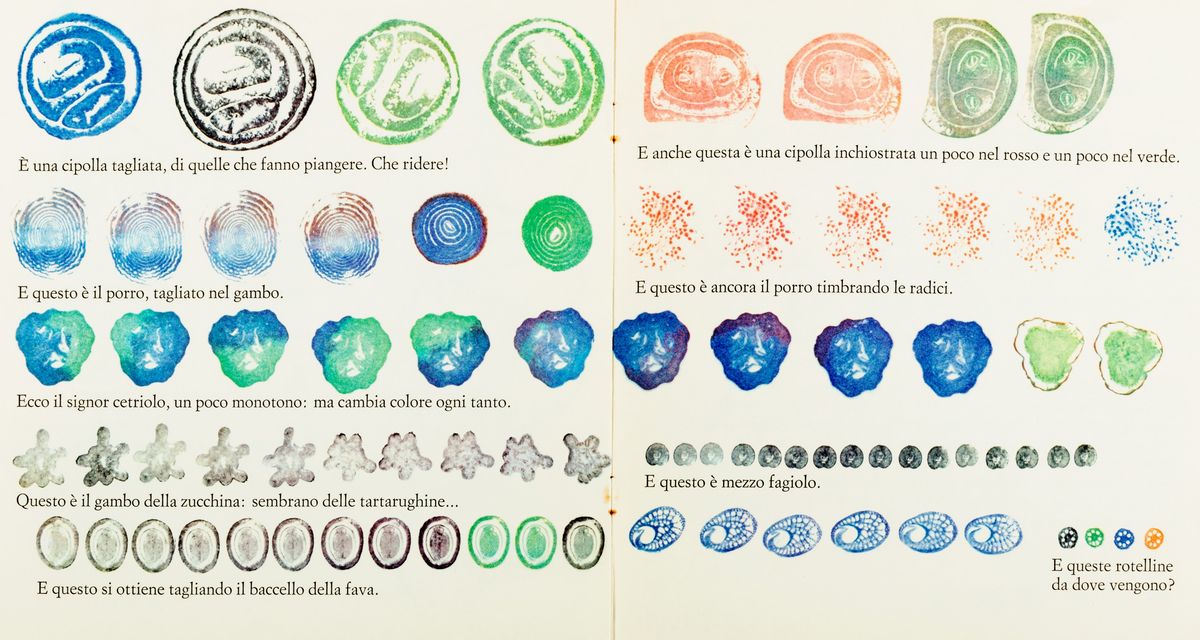 II opera: Prima edizione. [Bibliografia: Maffei 2002: pag. 141; Munari 1995: pag. 285]. "Usando il gambo tagliato dell'insalata come se fosse un timbro, Bernardino scopre che ci sono rose nell'insalata. Preso dall'entusiasmo della scoperta...".