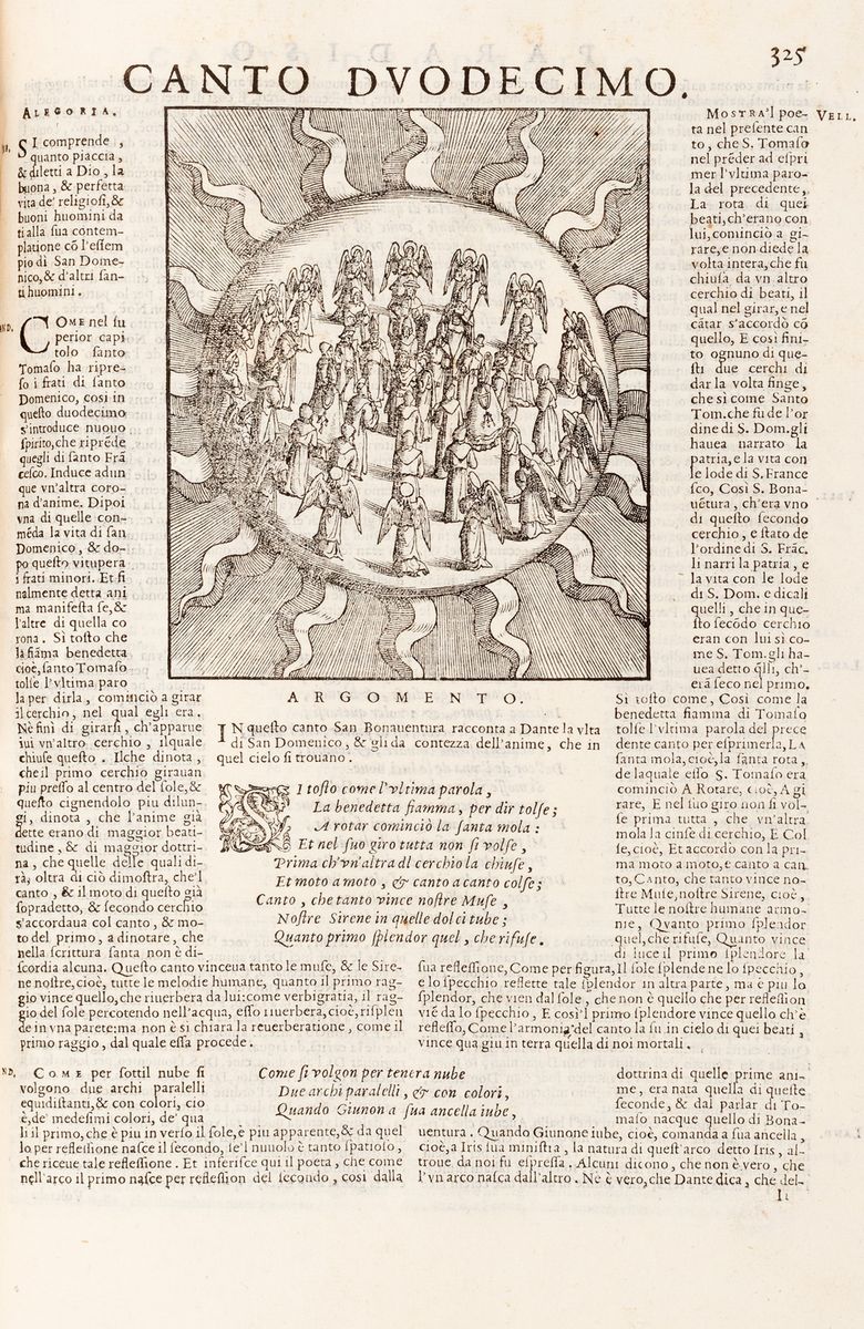 Venezia, Sessa, 1578. In 2°. Grande ritratto di Dante dentro ovale in ricca cornice xilografica al frontespizio, marca tipografica al colophon, una grande tavola xilografica con altro ritratto di Dante, rappresentazione dei tre regni, e ritratti dentro medaglione di Virgilio e Stazio, 97 illustrazioni xilografiche, grandi tavole incise in legno all'inizio di ogni cantica, splendide testatine e capilettera figurati, testo in carattere corsivo al centro contornato dai commenti in carattere tondo su due colonne,  piccoli fori di tarlo al frontespizio, nel margine interno della maggior parte dell'esemplare ed all'ultima carta di entità diversa, alcune carte brunite, leggere macchie, legatura coeva in pelle marrone, ai piatti decorazione impressa a secco, dorso a 3 nervi, restauri e fori, astuccio in cartonato grigio moderno. Al frontespizio firma di appartenenza.