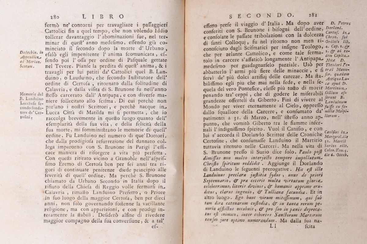 Lucca, Vincenzo Giuntini, 1756. In 4°. Con una carte di tavola incisa in rame che riproduce la miniatura del Cod. Vat. Lat. 4922 in cui Donizone offre il suo poema a Matilde ripetuta due volte, fregio al frontespizio, leggera brunitura, lievi fioriture, leggera gora d'acqua al margine inferiore di alcune carte, legatura coeva in pergamena rigida, titolo e autore impressi in oro entro tassello al dorso, lievi bruniture.