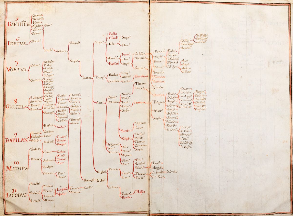 Manoscritto pergamenaceo composto da 16 carte, 280 x 410 mm., contenente 33 alberi genealogici della famiglia Doria, in fine alcuni documenti trascritti relativi alla storia della famiglia Doria, "Compendium breve Ill.m Viror. nobilis Familiae de Auria qui in bello classico claruere contra hostes Ianuensium."