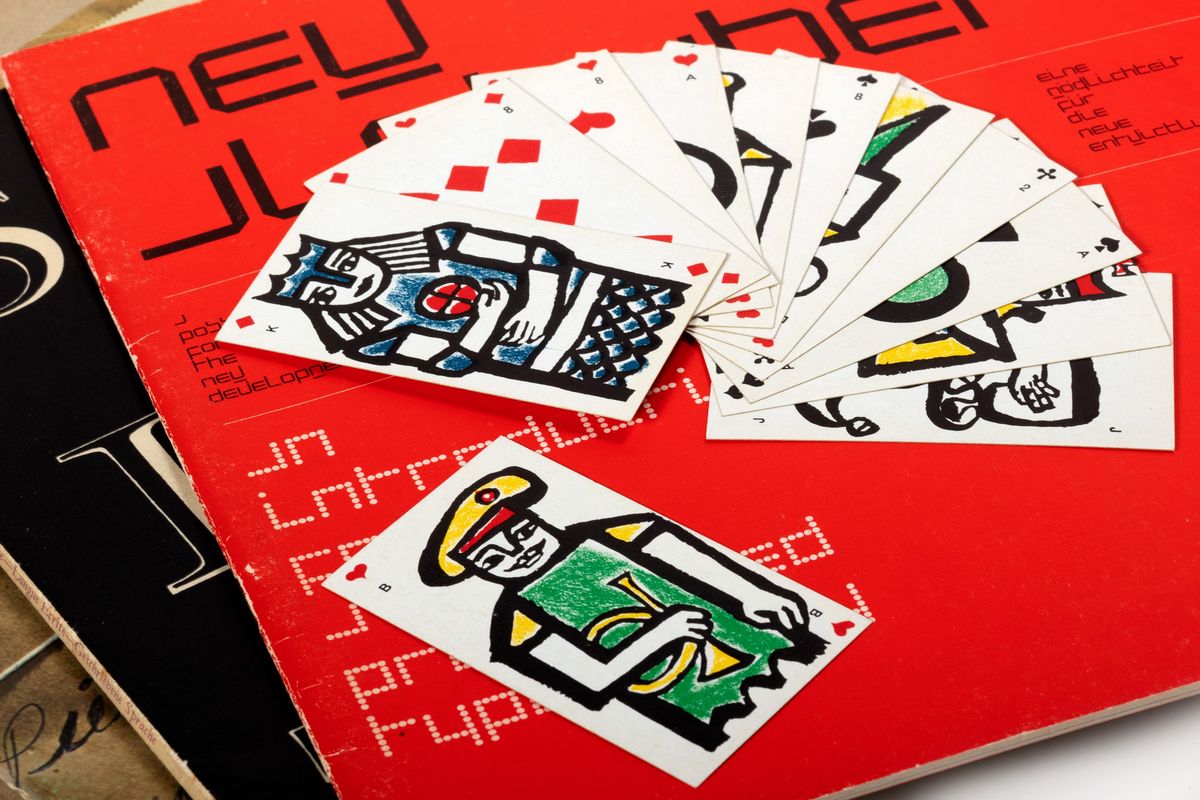 Hilversum, Steendrukkerij de Jong & Co., [stampa: Steendrukkerij de Jong & Co.], 1960/1974, (20 voll cm 25x25 cm) 1) Wim Crouwel, Possibility for the new development. Proposal for a new type that, more than the traditional types, is suited for the composing system with the cathode-ray tube (CRT), 1967, pp. [16], 5 illustrazioni; 2) Aloisio Magalhães, A topographic analysis of a printed surface, 1974, pp. [112], 52 illustrazioni a colori; 3) Cees Timmer, The sick lion and the fox, s.d., pp. [6], 1 litografia a colori; 4) Henry Miller, Extra mailing Written language, s.d. (anni ‘70), pp. [16], 4 illustrazioni a colori; 5) Pim van Boxsel, The marvelous adventures of Philomene told in drawings by Pim van Boxsel, 1966, pp. [84], 71 illustrazioni in bianco e nero; 6) AA.VV, Liber Amicorum, 1971, pp. [100], 336 illustrazioni in bianco e nero; 7) Wim Spreeuwers, senza titolo, 1970, pp. [16], 16 illustrazioni in bianco e nero; 7) Mart Kempers, 3 litho’s, s.d., pp. [3], 3 litografie a colori; 8) Gerard Wernars, A cheerful heart has a continual feast, 1961, pp. [16], 11 illustrazioni a colori e 1 oggetti di carta velina applicato alle pagine; 9) Ton de Leeuw, Music and Technics, 1960, pp [24], 22 illustrazioni a colori; 10) Simon Vinkenoog e Tom Raateland, Written Language ii, 1963, pp. [56], con 20 poesie di vari autori trascritte manualmente in facsimile; 11) Simon Vinkenoog e Tom Raateland, Written Language i, 1961, pp. [76], con 18 poesie di vari autori trascritte manualmente in facsimile; 12) Paul Van Reeuwijk, Musicpaper, 1970, cartella contenente 3 fascicoli con al loro interno vari “Playing Materials”, ovvero dei cartoncini colorati con i quali giocare; 13) Simon Vinkenoog e Tom Raateland, Written Language iii, 1969, pp. [80], con 18 poesie di vari autori trascritte manualmente in facsimile; 14) Sandberg, Nu 2, 1966, pp. [120], 15 illustrazioni a colori; 15) B. Majorick, Jan Bons, G. Rietveld, s.d. (anni ‘60), pp. [28], 6 illustrazioni nel testo, completo del foglio ripiegato lungo 283 cm sul quale è riprodotto il lavoro di Jan Bons a colori a supplemento del volume; 16) Boris Küllmann, Zelf vormgevers slapen in hemelbedden.. en een beetje science-fiction design, 1963, pp. [28], 15 illustrazioni a colori e in bianco e nero; 17) Gerard Unger, A counter-proposal, s.d. (anni ‘60), pp. [8], con 5 composizioni tipografiche tra le pagine; 18) Will Burgin, Visuele aspekte van de wetenschap, s.d. (anni ‘60), pp. [20], 19 illustrazioni a colori nel testo; 19) Pieter Brattinga, Cijfer (figure), 1971, scatola di cartone numerata sul coperchio contenente molteplici facsimile di scontrini; 20) H. P. Doebele e G. Wernars, senza titolo, s.d. (anni ‘60), pp. [10], cartoncino contenente 5 fogli sciolti e 1 mazzo di carte da gioco illustrate dagli artisti.