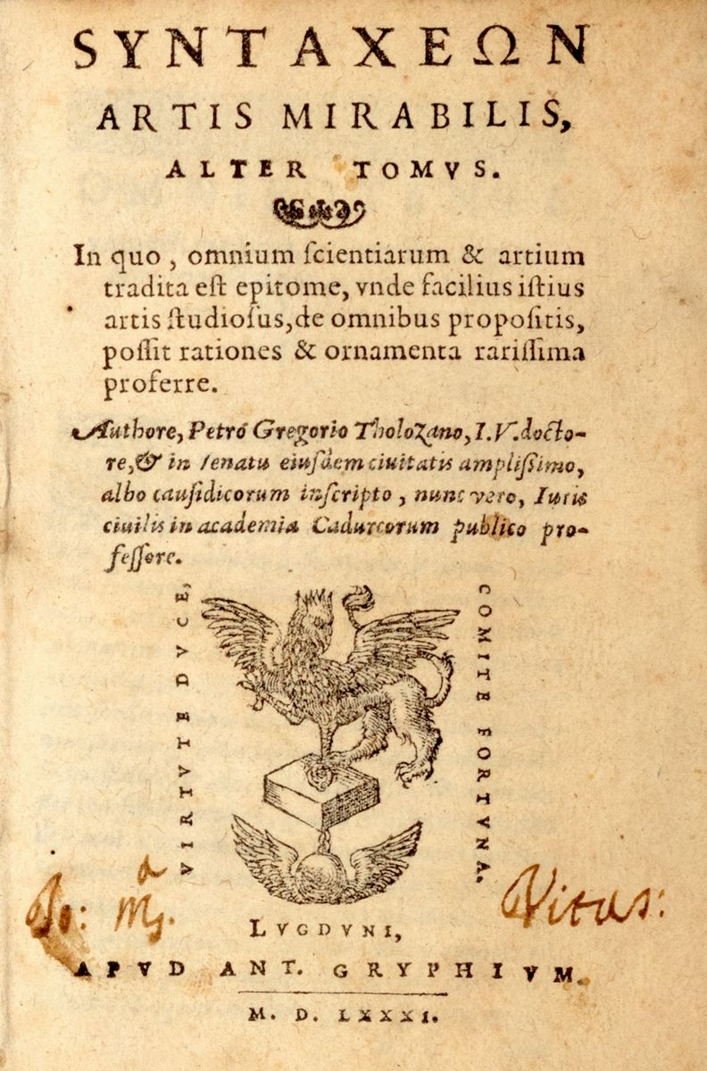 Due belle edizioni lionesi del Syntaxes artis mirabilis, (1578). Una sorta di enciclopedia del sapere scientifico in cui il giurista, filosofo ed enciclopedista francese Pierre Gregoire (1540-1597) intreccia scienze e matematica con demonologia, magia e astrologia. Il libro fu presto messo all'indice. L'opera riscosse notevole successo.