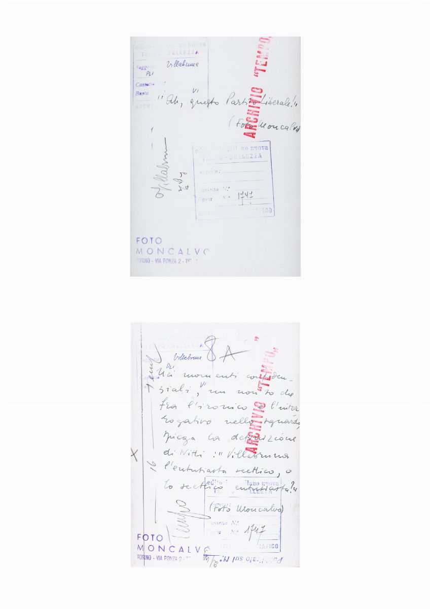 Nei momenti confidenziali, "un non so che fra l'ironico e l'interrogativo nello sguardo, spiega la definizione di Nitti: Villabruna, l'entusiasta scettico, o lo scettico entusiasta?". Così si legge al verso di una delle due foto, e il ritratto di Moncalvo combacia perfettamente con l'arguto ritratto in parole di Nitti.