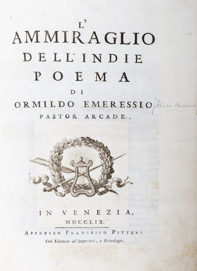 Prima edizione di questo poema in 10 canti in ottave sulla scoperta dell'America e le navigazioni di Colombo, pubblicato da Alvise Querini con il suo nome in Arcadia [Ormildo Emeressio] e nato con le ambiziose intenzioni di ricalcare, su tale tema, la grande poesia ariostesca e tassiana. Il Querini fu letterato ed ambasciatore della Serenissima a Parigi. Questa è la sua opera più significativa dal punto di vista letterario.