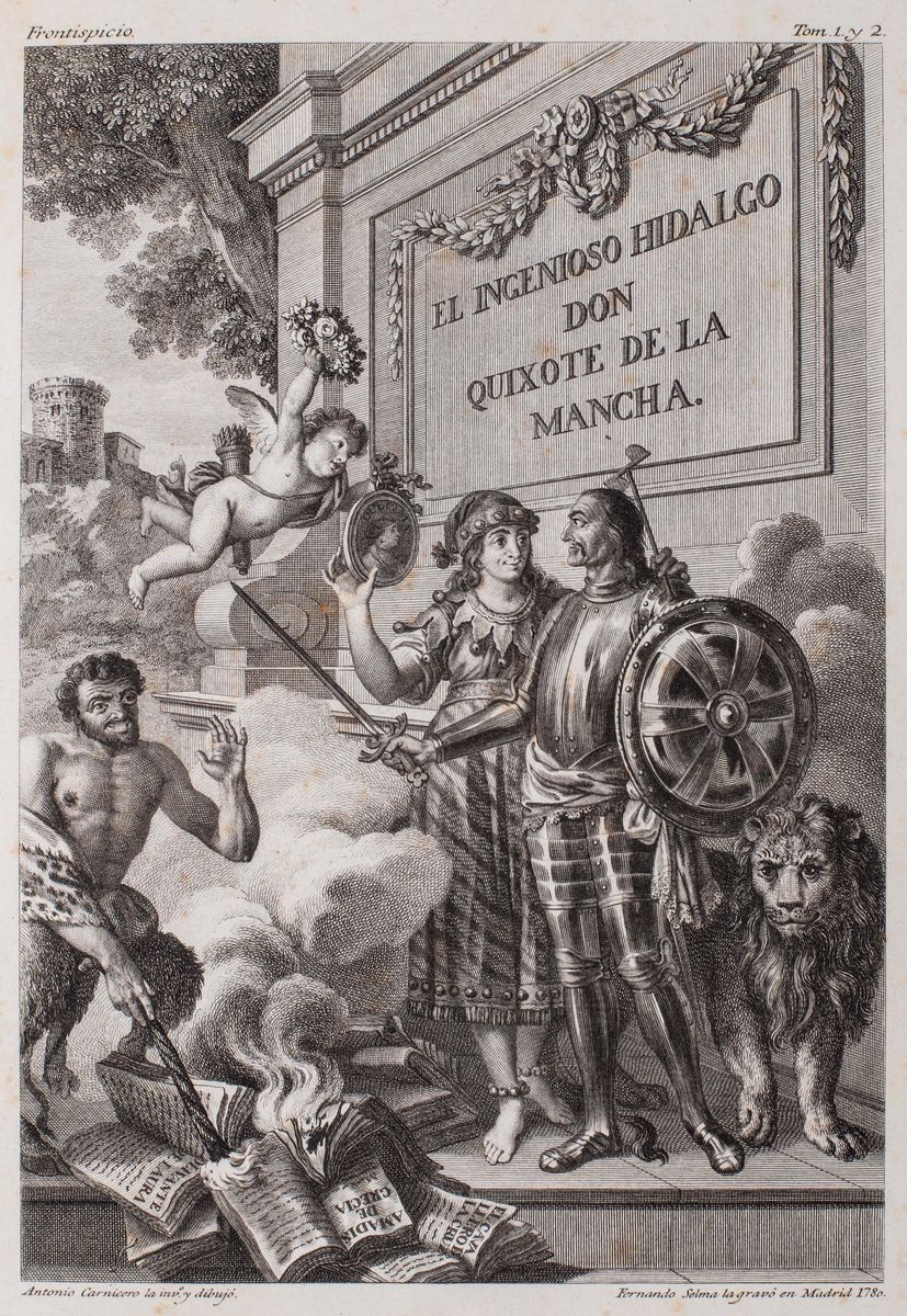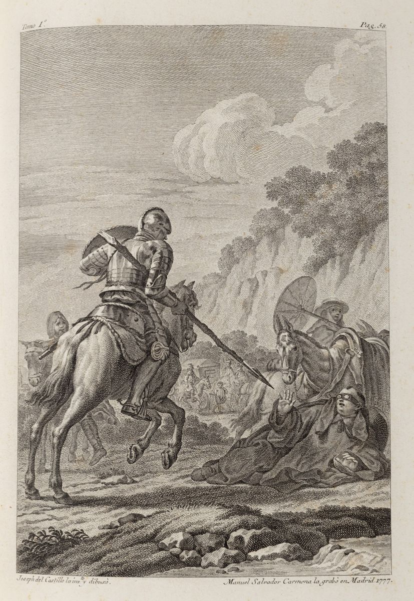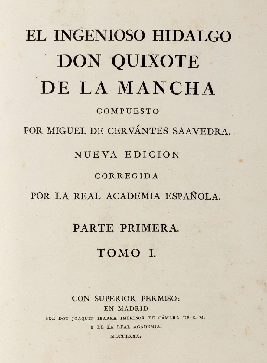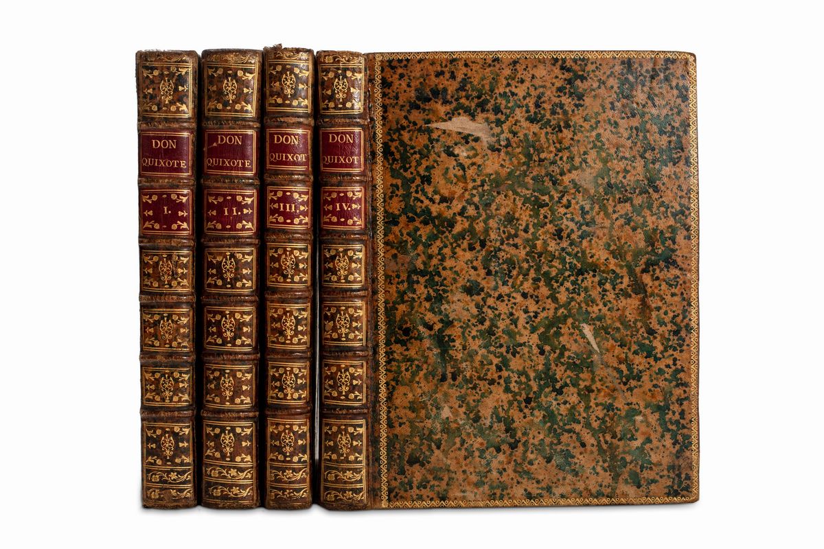 Madrid, Joaquin Ibarra e Real Academia Espanola, 1780. In 4°. 4 voll. con 4 antiporte incise su rame con 2 alla volta ripetute, 1 tavola incisa su rame con il ritratto di Cervantes, 1 carta geografica ripiegata nel primo volume, 31 tavole fuori testo incise su rame da Antonio Carnicero, Joseph Castillo, Bernardo Barranco, Joseph Brunete, 14 iniziali ornate, 22 vignette e 20 culs-de-lampe, qualche macchia, e fioriture, legature in vitello marrone marezzato in verde, dorso a 6 nervi con ai comparti tasselli in pelle rossa con titolo in e fregi in oro, spellature ai piatti. Ex libris inciso"Filippo Linati" ai contropiatti.