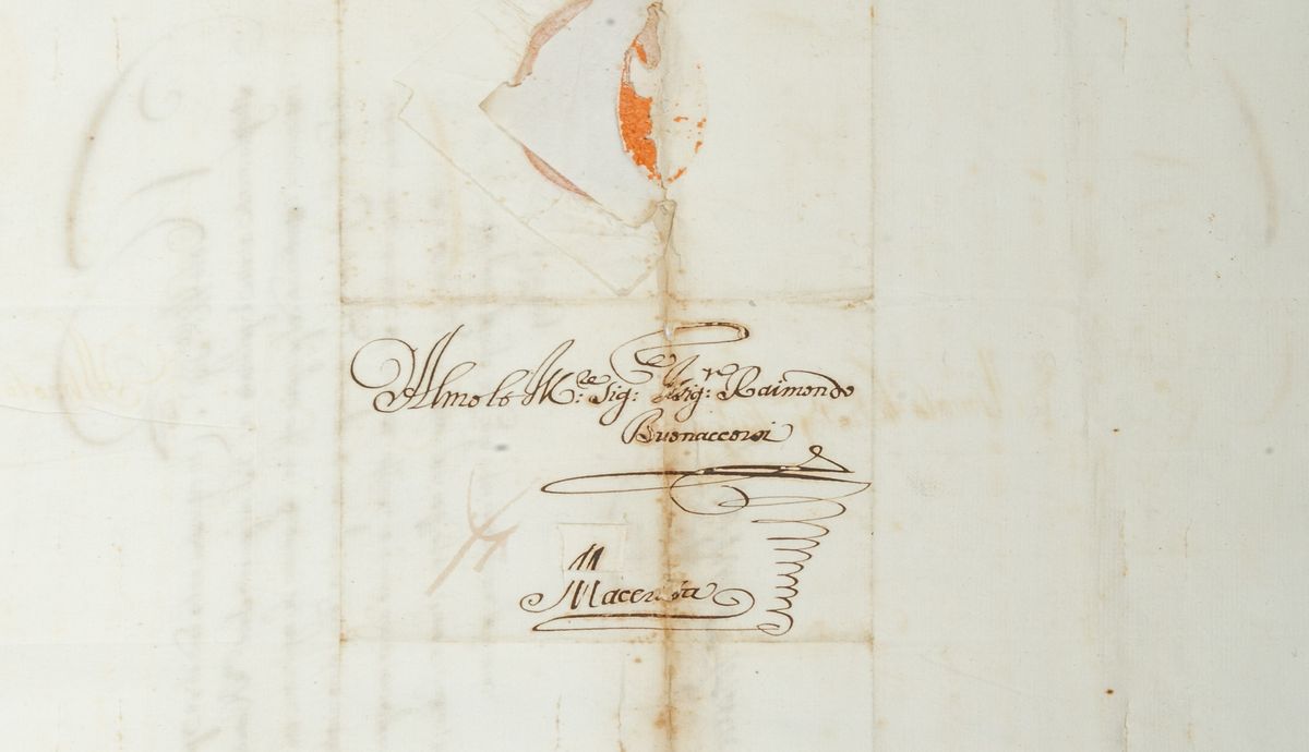 Lettera in 4°, 300 x 210 mm., sottoscritta in calce Il Granduca di Toscana, indirizzata a Raimondo Buonaccorsi di Macerata, datata Firenze 31 dicembre 1709.