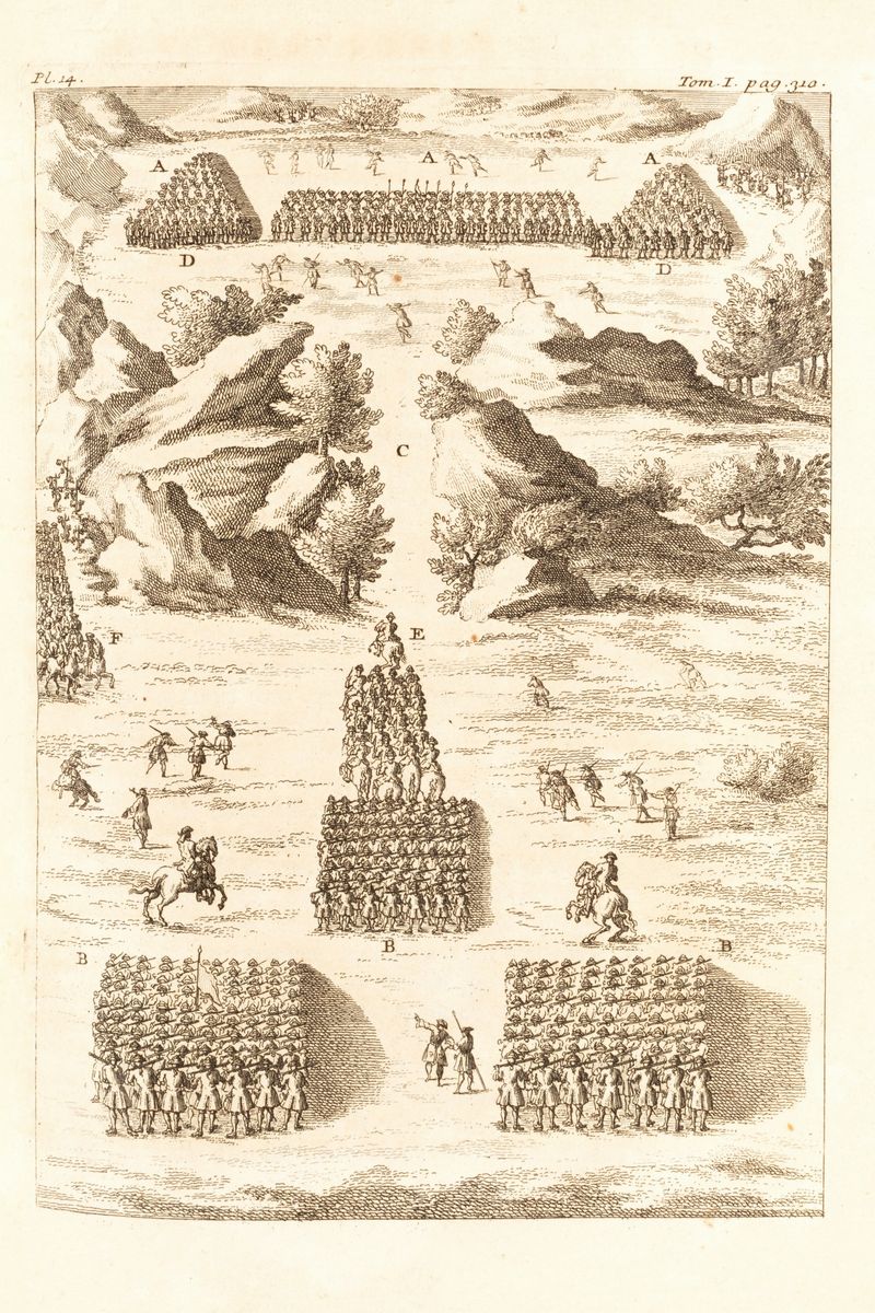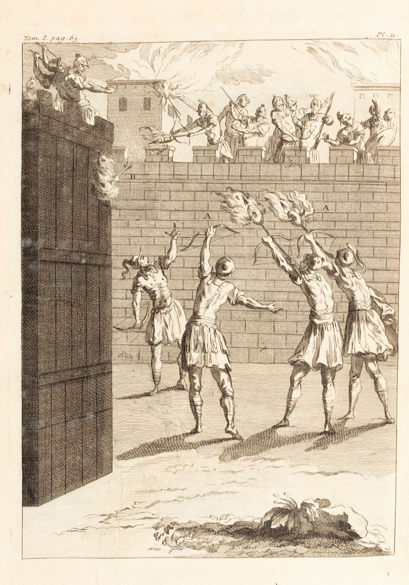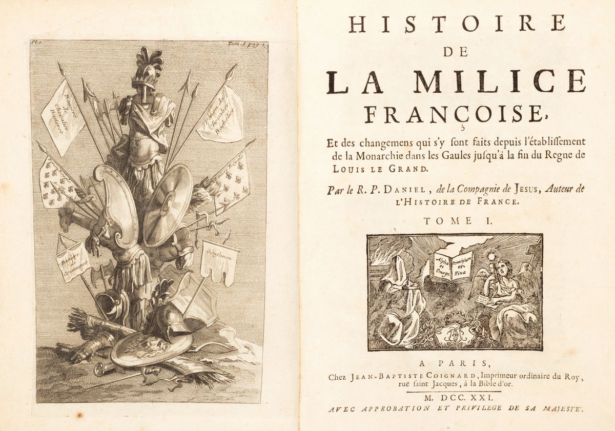 Prima edizione. Interessante storia militare della Francia dal sec. V al XVIII scritta dallo storico e gesuita Daniel Gabriel (Rouen 1649 - Parigi 1728), illustrata con numerose tavole incise in rame fuori testo che descrivono armi, scene di battaglia, costumi militari, navi.
