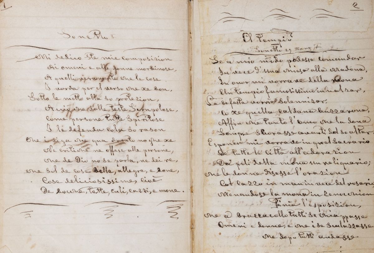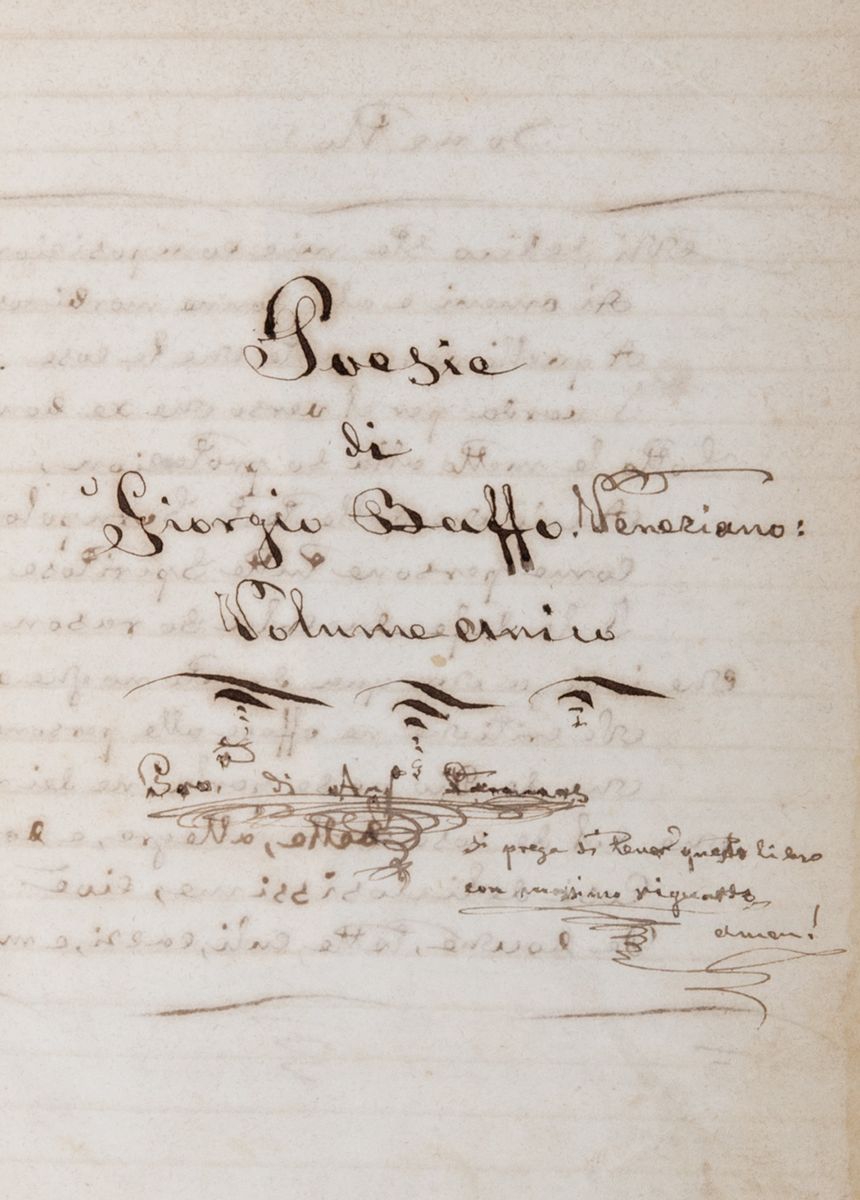 Ampio corpus manoscritto di oltre 500 componimenti poetici (una mano moderna ne indica 520), che iniziano dal proemiale Sonetto a pg.1, "Mi dedico ste mie composizion...", e si conclude a p.530 con l'Epitaffio in morte dell'autor, "Baffum. Qui in penetrandis, celebrandisque...". In mezzo tutto il repertorio virtuosistico del celebre cantore della Mona.
