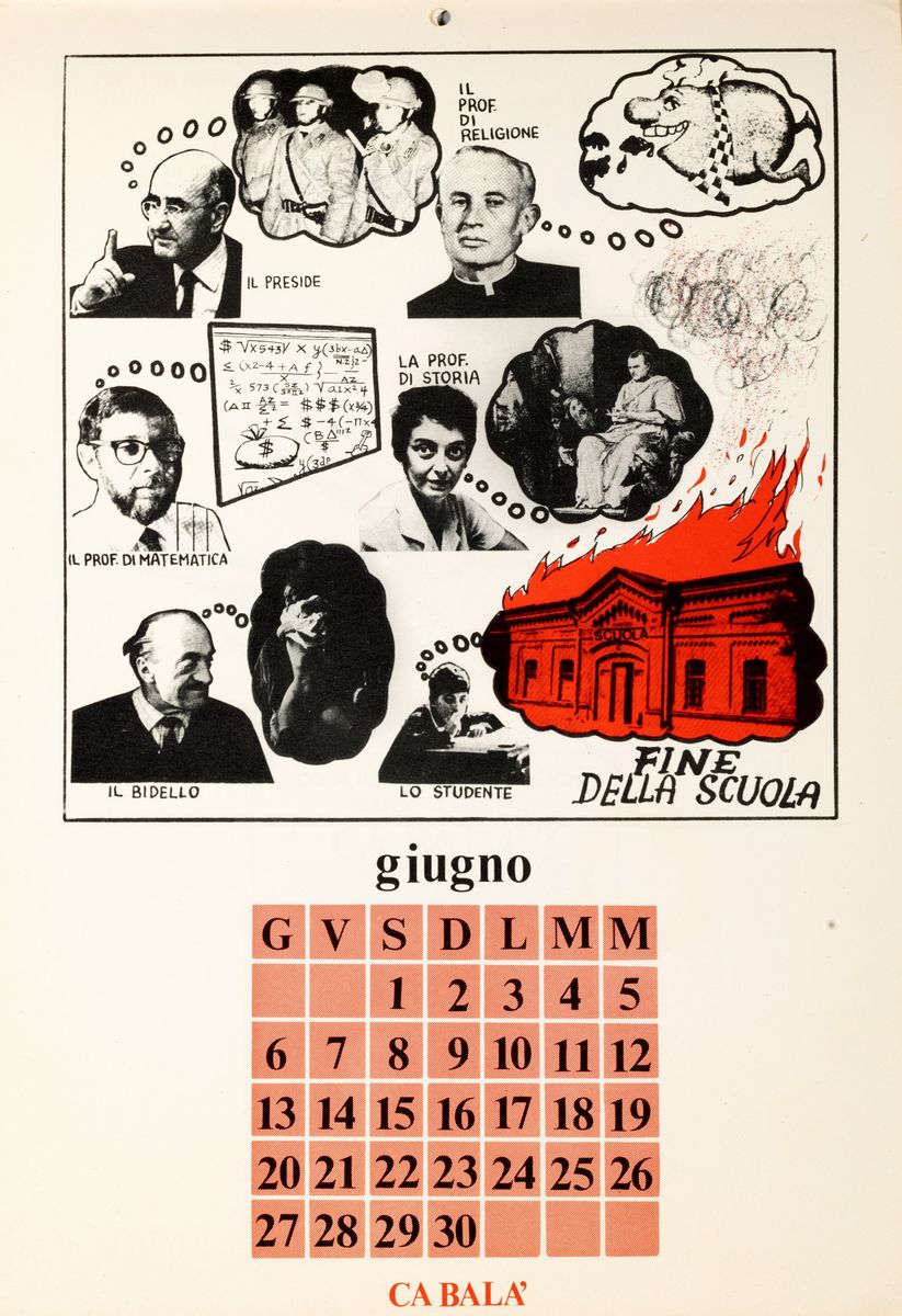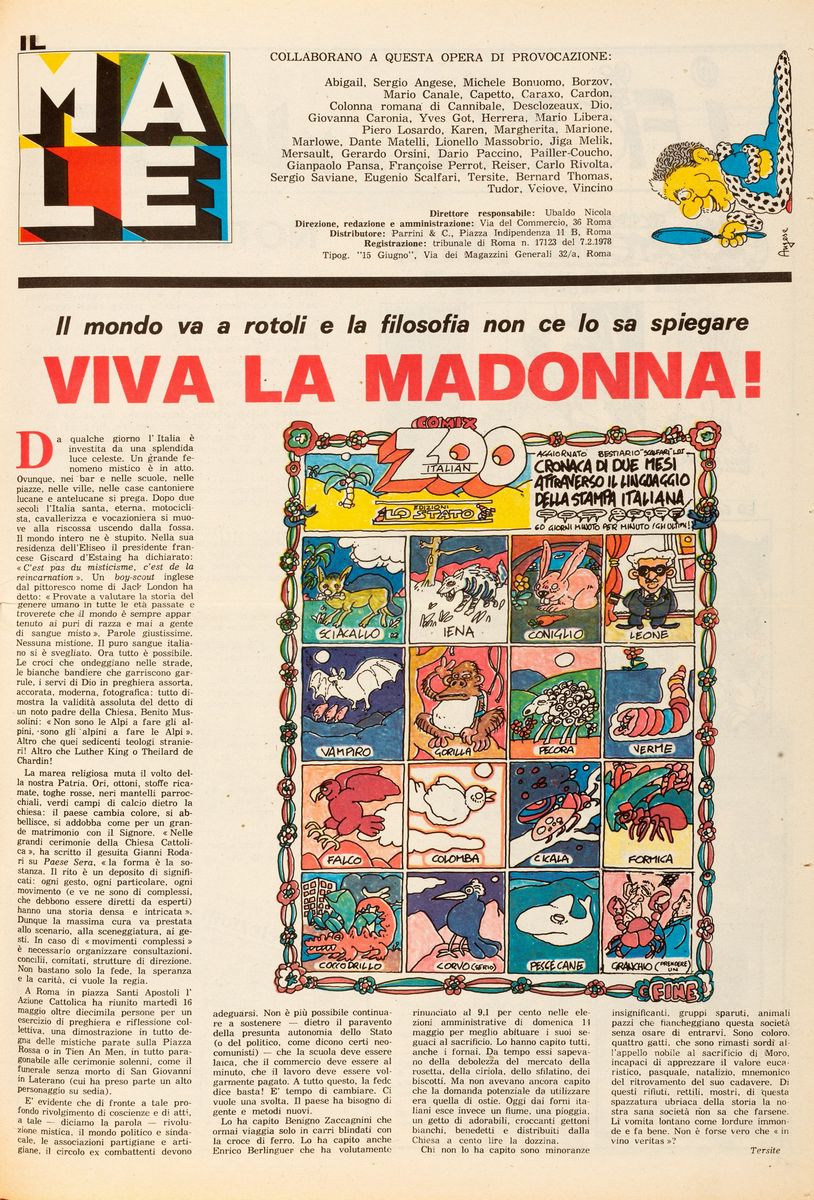 Roma, Tipografia A.B.E.T.E. - Roma (n. 1); Tipografia "15 giugno" - Roma (nn. 2 -37), 78-79. Anno I nn. 1-37; Anno II n. 38. Con numerose illustrazioni nel testo a colori e in bianco e nero e poster, qualche leggera brunitura, legatura coeva in tela rossa, titolo e anno impressi in oro entro tassello al dorso, lievi difetti. § Guareschi, Italia Provvisoria. Album del dopoguerra, Milano, Rizzoli, 1948. Con numerose illustrazioni in bianco e nero a piena pagina, leggera brunitura, primi fascicoli leggermente allentati, brossura editoriale in cartoncino rigido illustrato a colori con tela al dorso, parzialmente allentata rispetto al corpo del libro, difetti. § Gruppo Stanza, Settantaquattro umorismo grafico, Firenze, Ed. Stanza, 1970. Con 74 disegni di Graziano Braschi, Berlinghiero Buonarroti, Paolo della Bella, brossura editoriale in cartoncino illustrato a colori, lievi difetti alle cerniere. Esemplare n. 124 di 200 esemplari § Novello, Giuseppe, Resti fra noi, Milano, Mondadori, 1967. In 4°. Con 105 carte di illustrazioni in bianco e nero a piena pagina, brossura editoriale in cartoncino e sovraccoperta illustrata a colori, lievi difetti. § Calendario CA BALA' 1974. Anche gli orologi fermi hanno ragione due volte al giorno Ca Bala' ventiquattro, calendario illustrato della rivista satirica Ca Bala'.