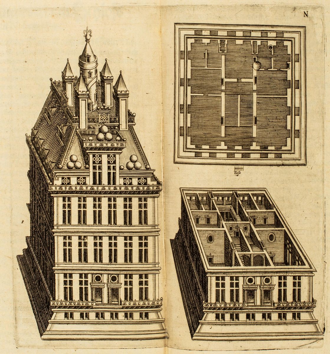 Francoforte, Wolffgang Richter per la vedova Dietrich de Bry , 1602. In 2°. Frontespizio achitettonico , con 17 (di 27) tavole di Theodor de Bry, alcuni fascicoli mancanti, leggera brunitura, qualche lieve alone, piccolo foro di tarlo su poche carte, legatura coeva in pergamena, difetti.