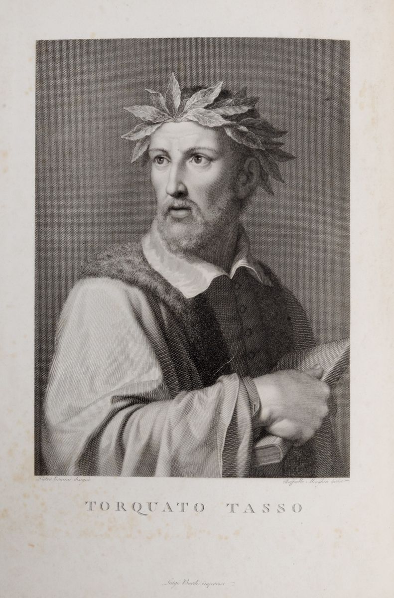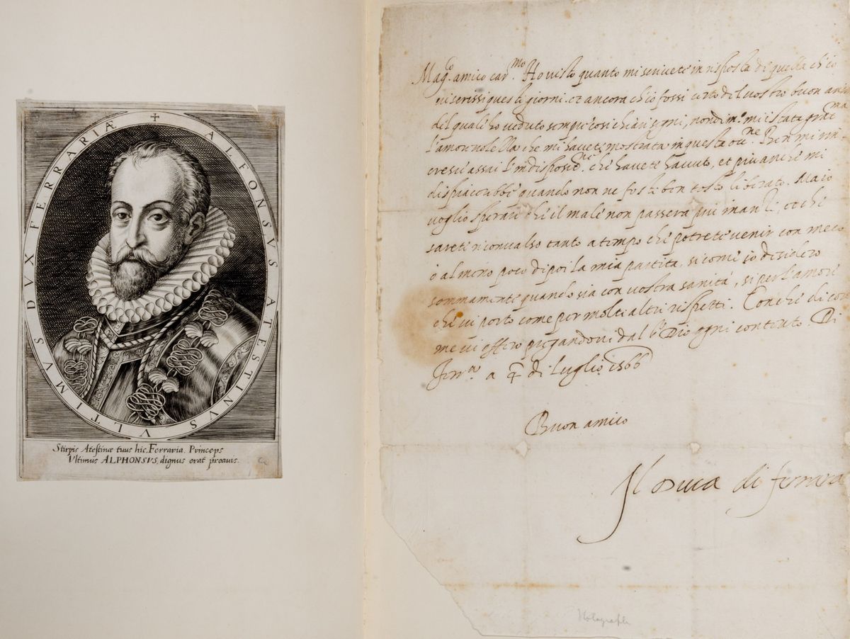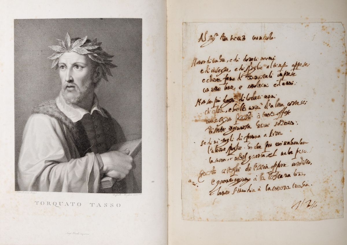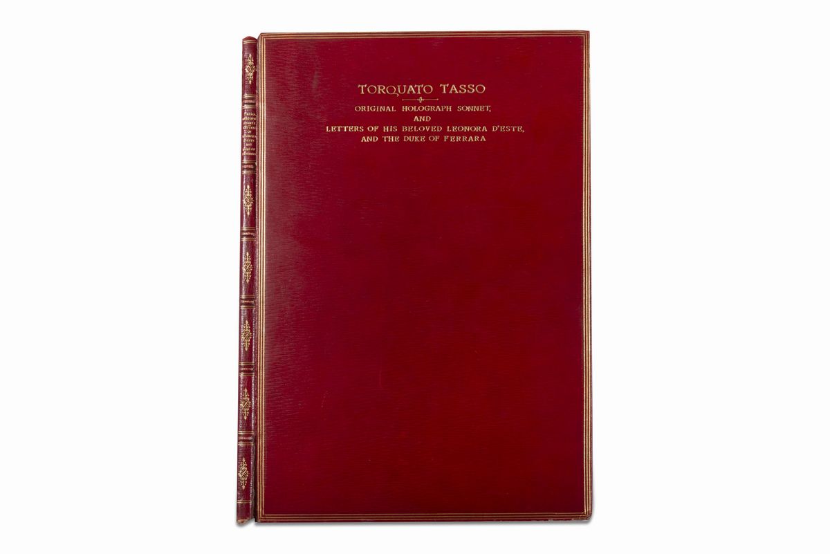 Elegante album in marocchino rosso contenente un sonetto di Tasso autografo e olografo indirizzato "Al Sig. Don Vincenzo Caracciolo", 205 x 262 mm., forellini dovuti all'ossidazione dell'inchiostro, a fronte ritratto di Tasso disegnato da Pietro Ermini e inciso da Morghen, nelle carte precedenti altro ritratto di Tasso disegnato da Bernardi e inciso sempre da Morghen; lettera con firma autografa di Leonora d'Este, inviata da Ferrara il 24 marzo 1574 e indirizzata ad Alfonso Duca di Ferrara, una pagina 212 x 320 mm., timbro a secco al verso; lettera autografa e olografa del Duca di Ferrara, Alfonso II d'Este, datata Ferrara, 4 luglio 1566; lettera del Duca di Ferrara, datata Ferrara 7 novembre 1587, indirizzata al Cardinale Santacroce; nell'album altre stampe di personaggi della corte estense, oltre a Tasso.