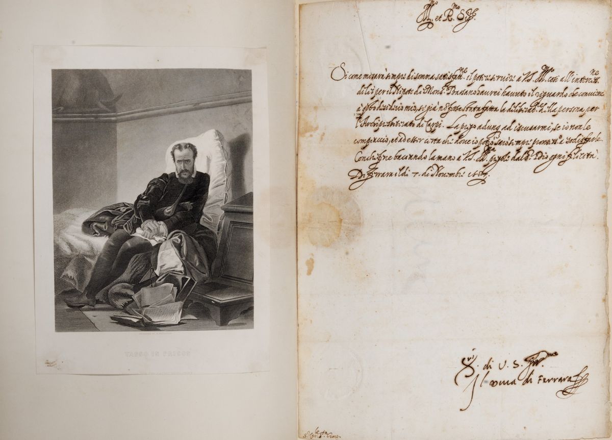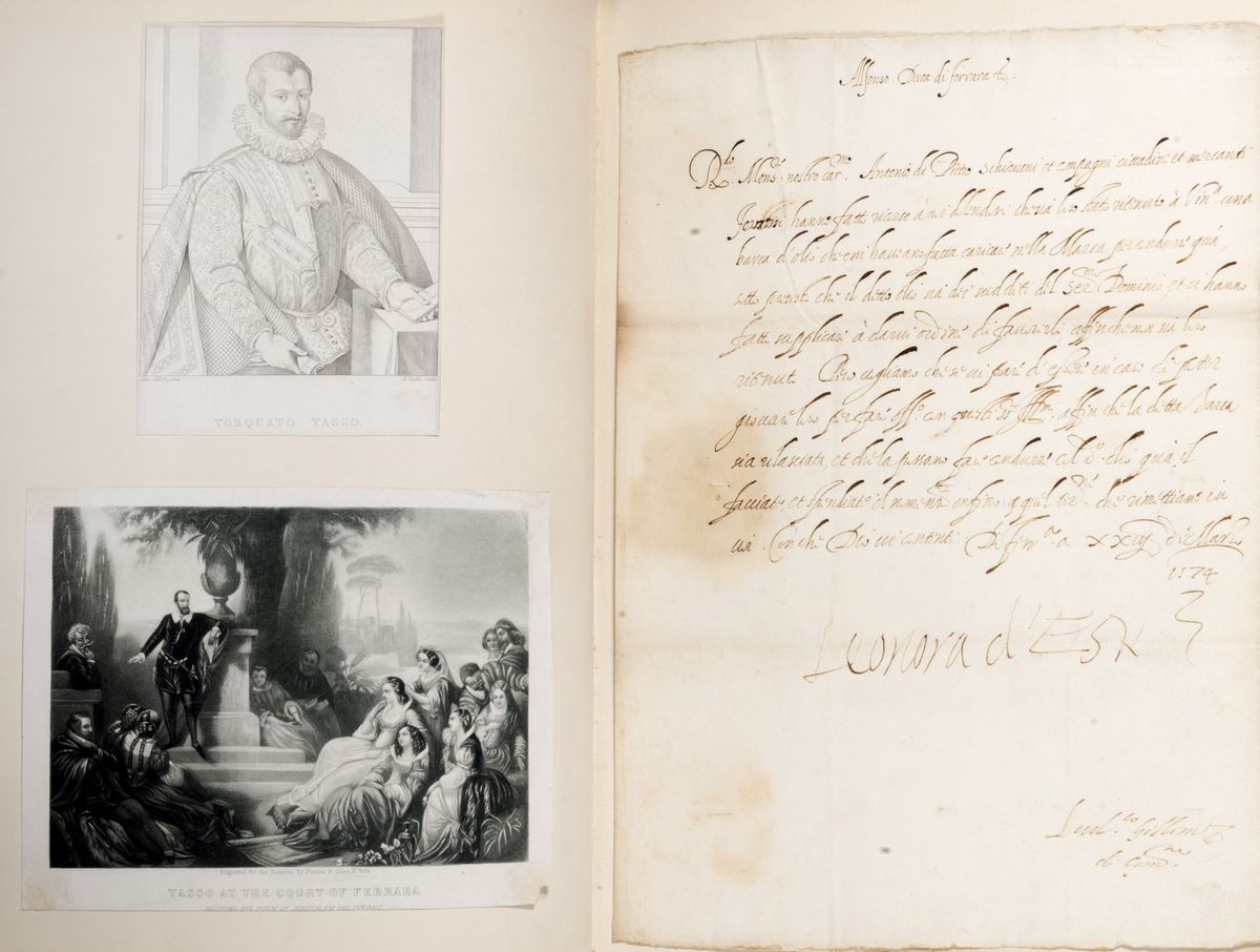 A fianco del sonetto ritrovato si dispongono altri interessanti documenti dell’epoca, raccolti con cura da un ammiratore anglosassone e conservati entro una prestigiosa legatura d’amatore. In primis la lettera di Leonora d’Este, presunta fiamma amorosa del Tasso, cui la tradizione ottocentesca ha attribuito un ruolo romantico quasi certamente ingiustificato. Tutto nasce da un paio di componimenti poetici a lei dedicati, Prega Dio per la salute di madama Leonora, e la splendida canzone Mentre cha venerar movon le genti; “da quest’ultima canzone partono numerose delle illazioni che hanno fatto del Tasso e della Leonora una coppia dall'amore infelice e travagliato: leggenda che tutto l'Ottocento e buona parte della critica del Novecento hanno accettato e anche alimentato” (Treccani, on line). Di contorno, ma non meno interessanti, le altre due lettere del Duca di Ferrara, a testimoniare il milieu culturale ferrarese che qui voleva essere celebrato. Tasso e i suoi amici, nella splendida cornice della Ferrara di secondo Cinquecento.