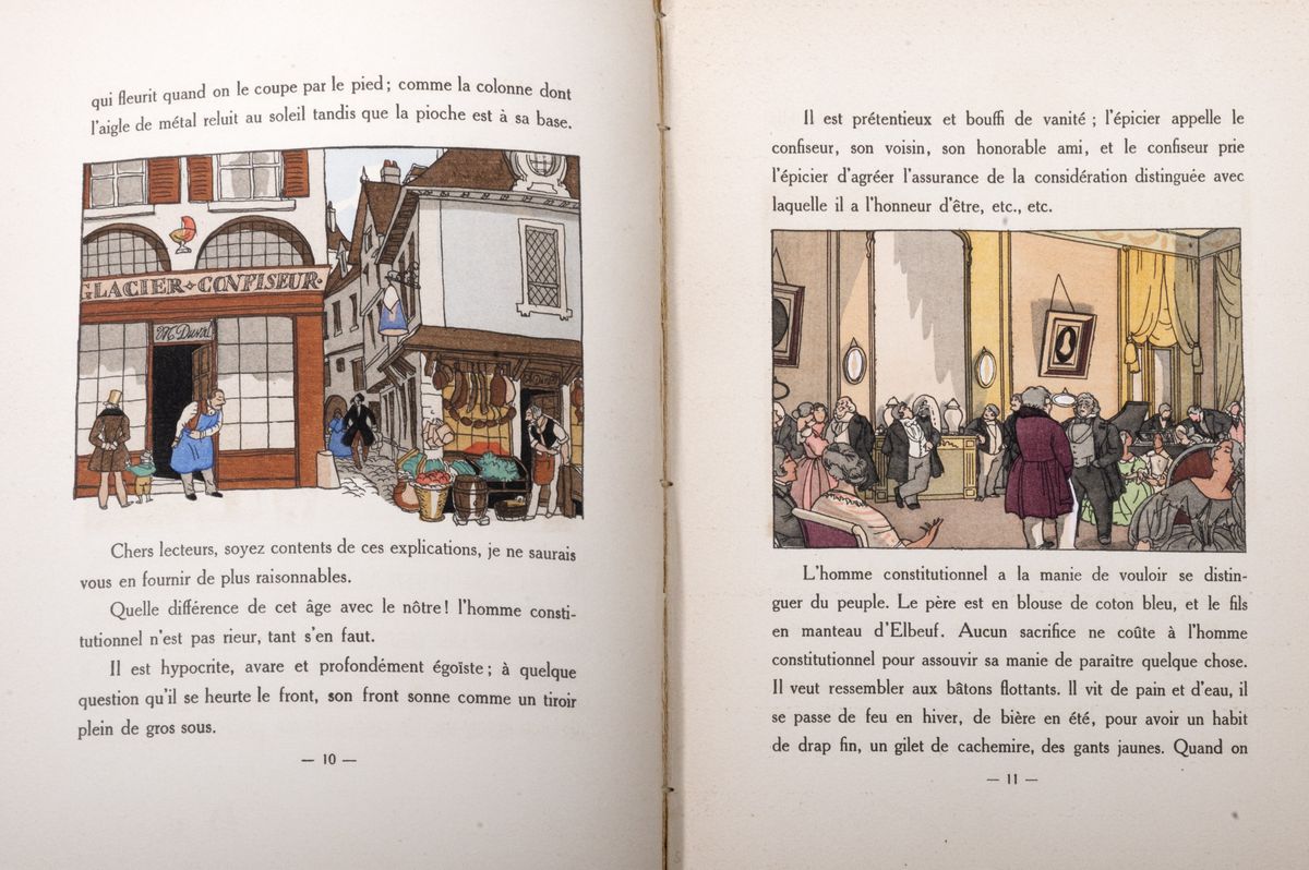 Parigi, Dorbon Ainè, s.d. (1930). In 8° grande. 2 voll. Frontespizio stampato in rosso e nero con vignetta, con 12 facsimile, inclusa la riproduzione del periodico l'Association del 6 marzo 1842, e 184 illustrazioni acquerellate a mano, fogli in barbe, qualche leggera ombra dovuta al trasferimento della coloritura sul foglio opposto, brossura editoriale entro legatura coeva in marocchino nocciola, 4 piccoli dischi impressi in oro agli angoli di ciascun piatto, al dorso piccoli dischi e filetti in oro, taglio superiore dorato, entro cofanetti editoriali, un minuscolo foro di tarlo al dorso del vol.II.