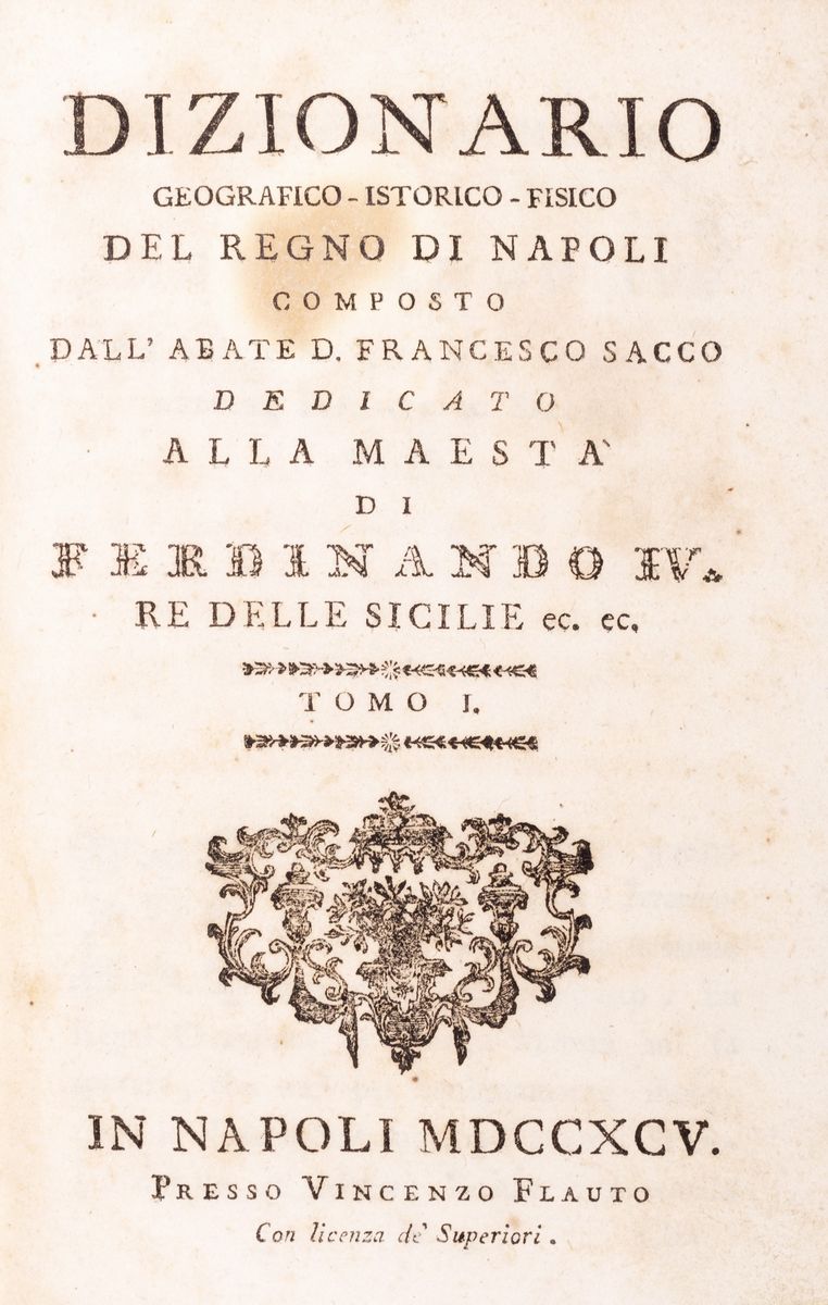 Napoli, presso Vincenzo Flauto, 1795-96. In 8°. 4 voll., testo su due colonne, pp. XVI-368; (4)-406; (8)-462; (8)-395. Legatura coeva in mezza pelle, titoli e fregi in oro al dorso. Lievi difetti