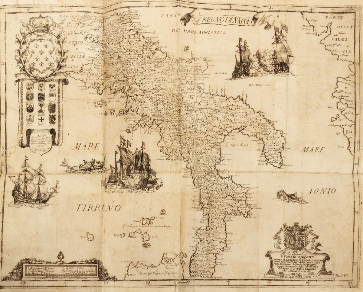 Napoli, Nella Stamperia di Michele Luigi Mutio/D.A. Parrino,. In 8°. 3 voll. Antiporta raffigurante Nettuno che emerge dal mare, pp. (12)-340; (8)-256; (8)-267 con 13 carte geografiche (Regno di Napoli e le 12 province), una veduta di Napoli in prospettiva e 160 vedute (ce ne sono 10 in più rispetto all'indice che ne riporta 152 considerando riportata due volte Oppido) per complessive 173 tavv.. Vol.I: 71 tavole e 5 carte geografiche ripiegate; Vol.II: 58 tavole e 4 carte geografiche ripiegate; Vol.III: 32 tavole e 4 carte geografiche ripiegate. Questo esemplare contiene una tavola in più rispetto a tutte le altre, ovvero la tavola che raffigura la Città di Monte Sant’Angelo. Legatura in piena pergamena, titolo calligrafico.