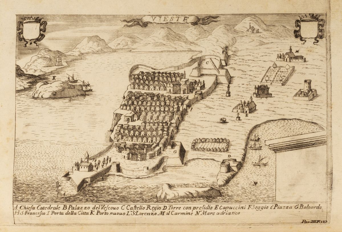 È la più importante e dettagliata documentazione, edita fino a quel tempo, di storia politico-militare, religiosa, urbanistica, economica ed artistica di 148 città con i loro territori, nelle 12 provincie costituenti l'allora Regno di Napoli. Ad un'esposizione generale, con i nomi delle personalità titolate, segue un lungo paragrafo sulla capitale. Quindi, di ciascun nucleo urbano, rappresentato in un'incisione, sono narrate le origini e gli interessi economici, le vicende storiche attraverso i personaggi in ogni campo, la topografia e i monumenti, le opere letterarie e le reliquie dei propri Santi. L'Autore, Giovan Battista Pacichelli (Roma 1634 - 1695), nacque a Roma da genitori pistoiesi e si laureò in giovane età prima in teologia a Roma e poi in diritto a Pisa. Nel 1672, nominato Protonotaro Apostolico viene mandato da Clemente X come Auditore della Nunziatura Vaticana alla conferenza di pace di Colonia. Ritornato a Roma nel 1677, dopo un lungo viaggio di studi in Germania, Olanda e Inghilterra fu chiamato alla Corte di Parma dal Duca Ranuccio II in qualità di suo consigliere, e dopo circa un anno mandato alla Corte Vicereale di Napoli per tutelare gli interessi che i Farnese avevano nel viceregno, in cui erano anche feudatari della città di Castellamare. A Napoli rimase per circa quindici anni, dove attese principalmente ai suoi studi e dove pubblicò quasi tutte le sue opere di argomento giuridico, teologico, geografico e topografico-descrittivo. La più importante "Il Regno di Napoli in prospettiva" fu pubblicata postuma e sebbene l'Imprimatur sia del 1696, essa vide la luce solo nel 1703 per le difficoltà economiche degli editori D. A. Parrino e M. L. Muzio. L'opera riprende le descrizioni del Regno, pubblicate nel corso del XVII secolo, dal Bacco, Mazzella, D'Engenio e Beltrano, ne ripropone il testo e si differenzia da loro per le numerose illustrazioni che per la prima volta raffigurano vedute prospettiche e a volo di uccello di grandi centri e piccoli paesi del Regno, oltre che per la Carta generale del Regno e per le dodici carte geografiche delle provincie. L’idea di inserire le illustrazioni, che rese famosa l'opera, fu degli editori e fu ispirata probabilmente all'opera di Pietro Bertelli "Theatrum Urbium Italicarum" pubblicata a Venezia nel 1599 e all' "Atlante del Regno di Napoli" di Luigi Bulifon pubblicato nel 1692. In particolare la veduta prospettica della città di Napoli incomincia ad abbandonare i canoni seicenteschi e viene presentata come tale, pur con una scarsa rispondenza topografica. Il paesaggio urbano è, come dire, "rettificato" secondo una linea ideale che congiunge Mergellina con monte Somma. Affine ai lavori di Cassiano de Silva (Cfr. Alisio, 1984) la vedutina dispone di 15 riferimenti topografici (A-P), tra cui, inusitato, il "Vomero". La dedica al marchese di Villena, vicerè dal 1702 al 1707 (data della capitolazione di Gaeta dinanzi alle truppe austriache) situa l'incisione al termine della sovranità spagnola sulla città e sul regno (Cfr. Pane-Valerio, 1988). Gli esemplari dell’opera con tutte le vedute sono pressoché introvabili e differiscono molte volte l’uno dall’altro a causa dell’ingente numero di tavole che a loro volta spesso non vengono riportate nell’indice. Ceci (1937, p.28) nel citare quest’opera evidenzia l’importanza storiografica delle notizie riguardanti le Provincie, difficilmente riscontrabili in altri libri. Bibliogr.: Catalogo Lubrano, 1929, p.31; Ceci, Bibliografia per la storia delle Arti figurative nell'Italia Meridionale, 1937, p.28; Alisio, Napoli nel Seicento. Le vedute di F. Cassiano Da Silva, 1984; Pane-Valerio, La città di Napoli tra vedutismo e cartografia, 1988; Fera-Morlicchio, Regno di Napoli e delle Due Sicilie. Repertorio bibliografico, 1994, vol.II pp.107-108; Cremonini, L'Italia nelle vedute e carte geografiche dal 1493 al 1894, 1995.