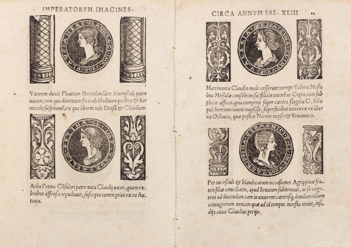 [Strasburgo, W. Koephel], 1534. In 4°. 2 parti in 1 vol. Due frontespizi con titolo contenuti in elegante cornice figurata, 268 medaglioni raffiguranti gli imperatori romani, illustrazioni e decorazioni, marca tipografica a piena pagina a carta V6v ed in fine volume, il tutto finemente inciso in legno su fondo nero, lacuna alla parte superiore del frontespizio supplita con carta manoscritta, lacuna nella parte inferiore di V3 e X2 supplita con carta manoscritta, inserto manoscritto ripiegato tra le carte A2 e A3, lievi fioriture, qualche rara arrossatura, legatura di epoca successiva in mezza pergamena, titolo manoscritto al dorso, alcune abrasioni, lievi difetti. § Simeoni, Gabriele, Illustratione de gli epitaffi et medaglie antiche, Lione, Giovan di Tournes, 1558. In 4°. Bella vignetta xilografica al frontespizio, al verso ritratto dell'autore, numerose illustrazioni incise in legno nel testo, frontespizio staccato, piccola lacuna al margine inferiore delle prime due carte, leggera brunitura, restauro al margine esterno delle ultime due carte, senza legatura.