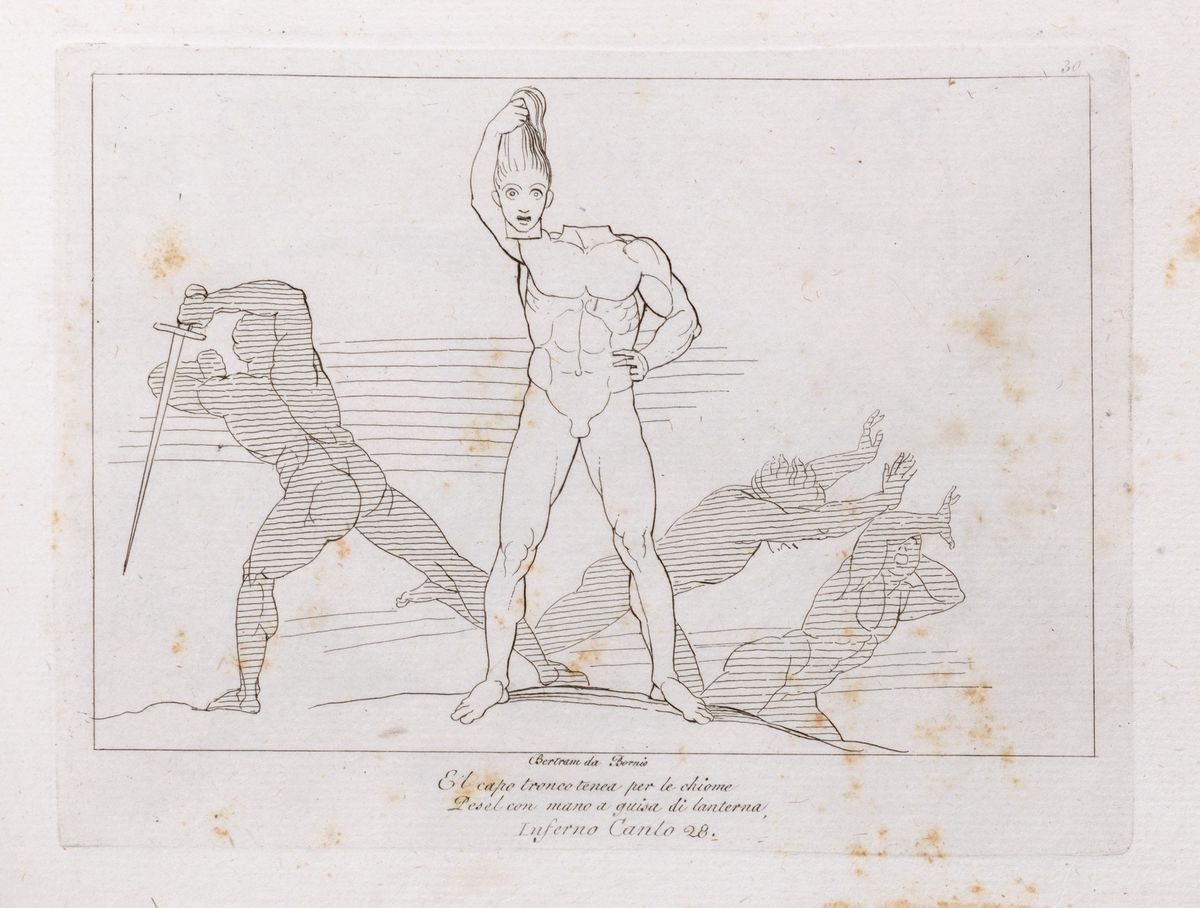 Su richiesta del giovane banchiere olandese Thomas Hope, il disegnatore e scultore inglese John Flaxman (York 1755-Londra 1826) accettò di eseguire le illustrazioni della Divina Commedia al compenso di tre ghinee ciascuna. Durante il suo soggiorno italiano, nel quale era dedito allo studio dell’arte antica, fra il 1787 e il 1794 realizzò le tavole con il suo stile grafico essenziale e lineare delineando le figure umane e le forti personalità con pochi tratti precisi. La moglie di Flaxman scrisse in una lettera che le illustrazioni di Dante “are drawn with simple lines, no Shadow, & treated in the beautiful Gothic taste with the Sentiment of the Poet & Artist united”