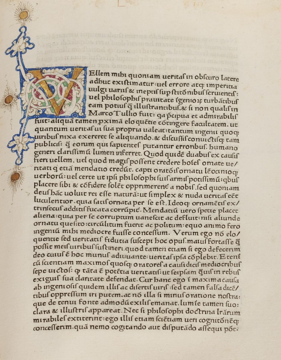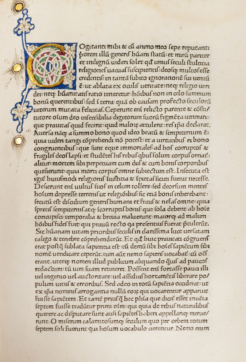 Roma, Conradus Sweynheym e Arnoldus Pannartz, 1468. In 2°. 342 x 230 mm. Grande pagina miniata ad apertura del volume, decorazione a bianchi girari con racemi in rosso, verde e blu, entro cornice a foglia d'oro, grande iniziale M a foglia d'oro, in basso stemma nobiliare con scudo su fondo rosso entro corona d'alloro, sul margine esterno uccellino di color verde, nel testo 8 iniziali miniate di varie grandezze a foglia d'oro e bianchi girari, una nona inizial in stile diverso più piccola (ma sempre coeva), due delicati restauri antichi a c.42 e 61 sul margine bianco, forellini di tarlo alle carte finali, restauro al margine bianco dell'ultima carta del colophon, qualche lieve alone, copia genuina e straordinariamente fresca. Legatura in pergamena rigida del sec.XVIII con doppio tassello al dorso per titolo e datazione dell'opera.