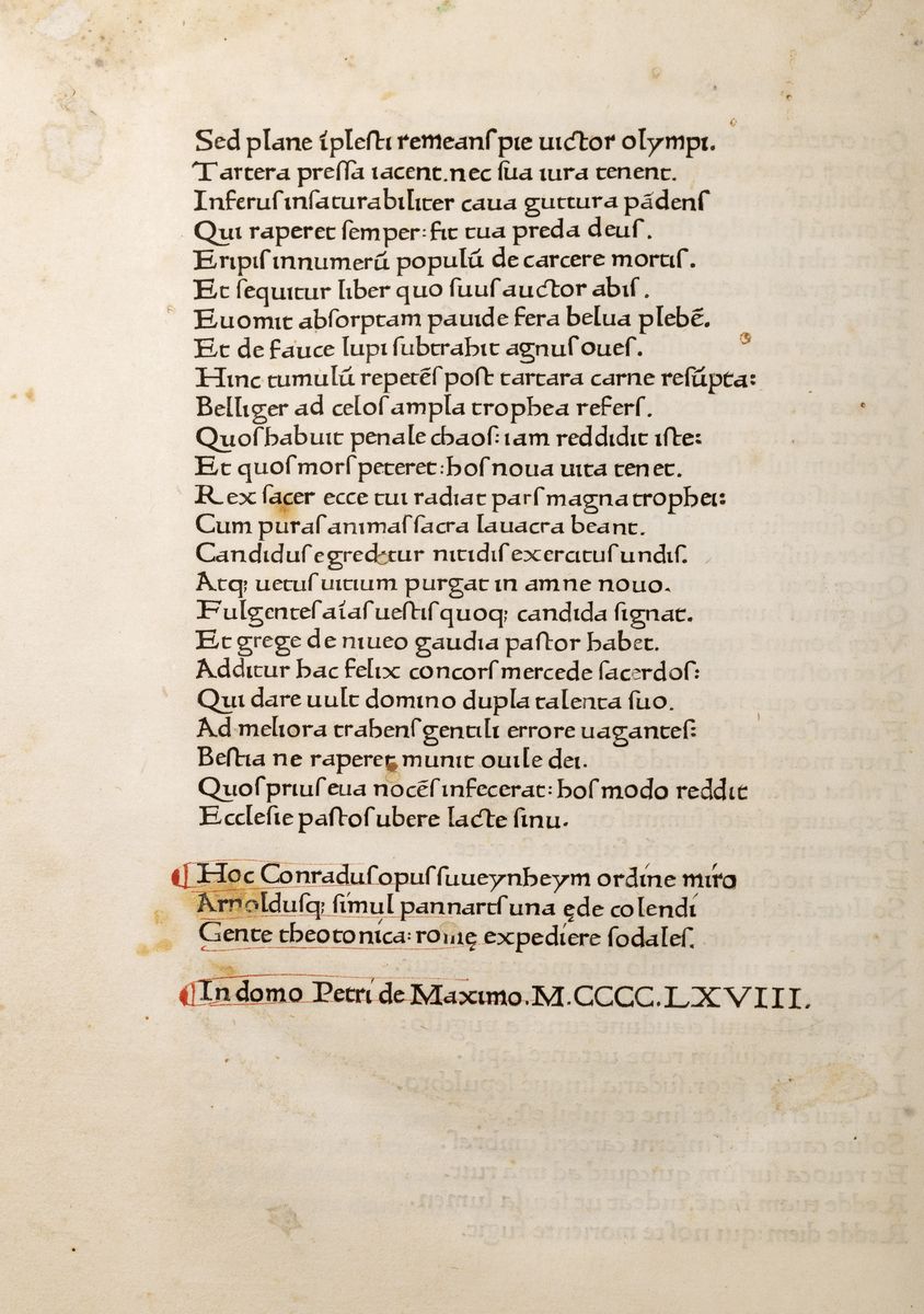 Contiene: De divinis institutionibus; De ira dei; De opificio dei vel de formatione hominis; De phoenice carmen. Venantius Fortunatus: De resurrectione Christi. Dopo la breve esperienza di Subiaco, su sollecitazione di Giovanni Andrea Bussi nel 1467 i due prototipografi tedeschi si trasferiscono a Roma ed instaurano un’officina tipografica "in domo Petri et Francisci de Maximis iuxta Campum Florae". Ovvero a Palazzo Massimo dietro piazza Navona. Il primo volume stampato a Roma, di cui è nota una data certa, è l’opera racchiudente le Epistolae ad familiares di Cicerone, a cui seguono certamente altre quattro edizioni: la seconda del Lattanzio (quella qui offerta nel lotto), lo Speculum di Zamorense, la seconda edizione del sant’Agostino e i Trattati e le Epistole di san Girolamo, edite in due volumi. Tutte queste edizioni sono quasi sempre pubblicate in-folio, alcune di dimensione sorprendente e con una tiratura che varia tra i 275 e i 300 esemplari ciascuna. Goff L2; HC 9807*; Pell Ms 6985 (6937); CIBN L-2; Delisle 1045; Polain(B) 4507; IDL 2863; IBE 3412; IGI 5620; IBPort 1059; Martín Abad L-1; Günt(L) 2520; Kind(Göttingen) 2307; Rhodes(Oxford Colleges) 1066; Bod-inc L-003; Sheppard 2599; Pr 3291; BMC IV 4; BSB-Ink L-3; GW M16542