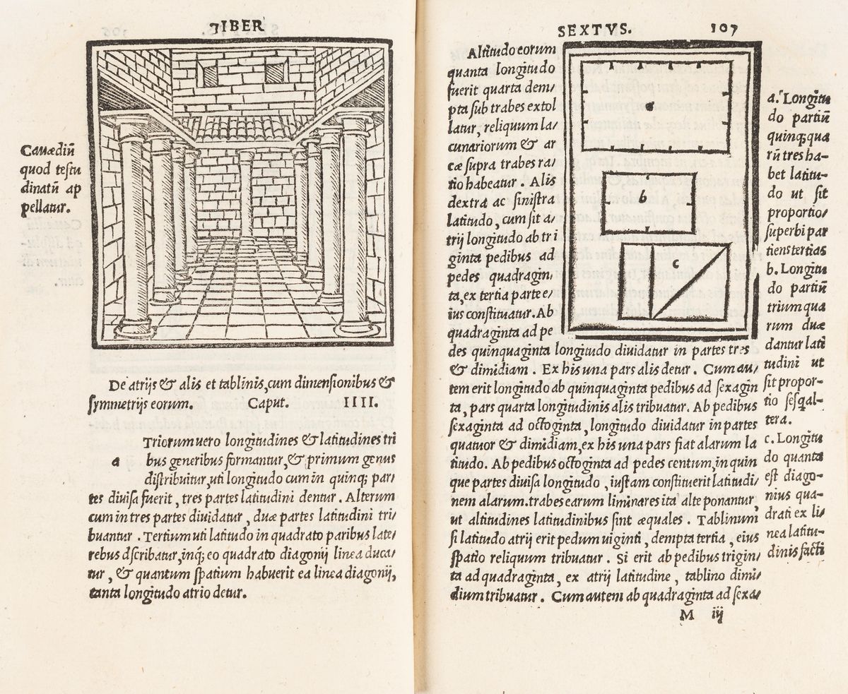 Celebre edizione giuntina. L’impostazione dell’edizione riprende la giuntina del 1513, con il commento di Fra Giocondo e il testo di Sesto Giulio Fiorentino, la forma della pagina viene però rinnovata e gli errori corretti, mentre la matrice per le incisioni in legno rimane la stessa. Giovanni Giocondo di Verona (1433-1515), frate domenicano, fu uno dei primi sostenitori di un gusto antiquario e venne nominato nel 1513 sostituto del Bramante nei lavori di S. Pietro a Roma. Adams V 904; Berlin Kat. 1800; Cicognara 699; Fowlwe 396; Sander 7697. 1