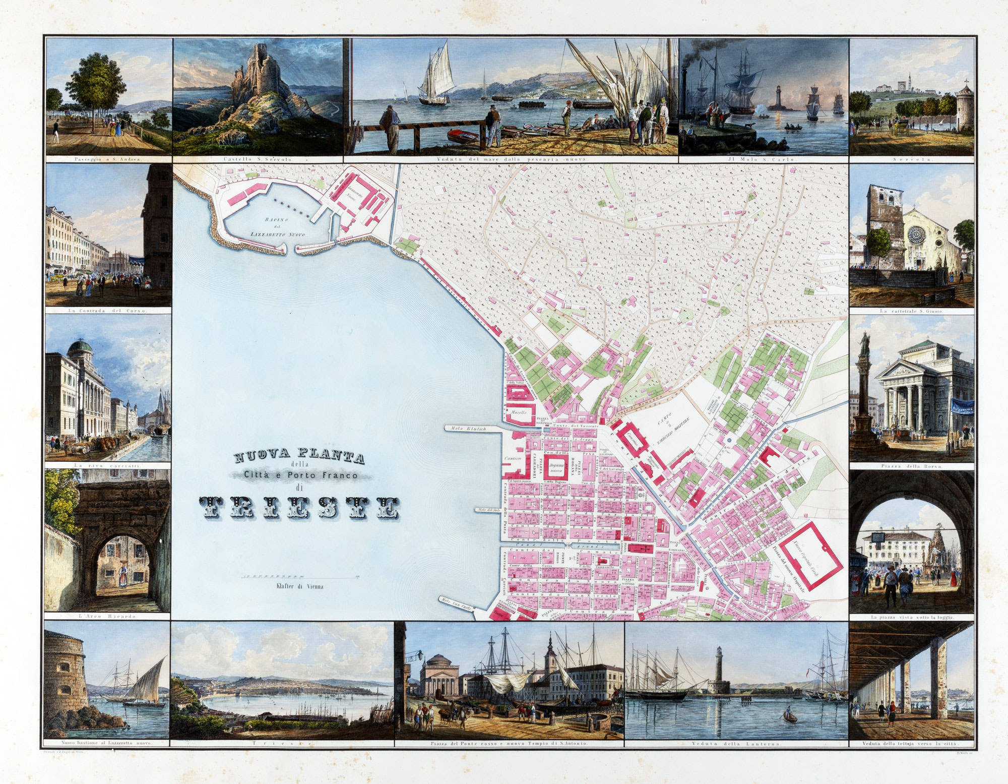 Rara pianta della città di Trieste arricchita da 30 scorci della città e dei suoi monumenti, tra questi Piazza della Borsa, la Cattedrale S. Giusto, Piazza S. Pietro e Piazza del Teatro, il tutto finemente inciso in rame ed acquerellato d'epoca.