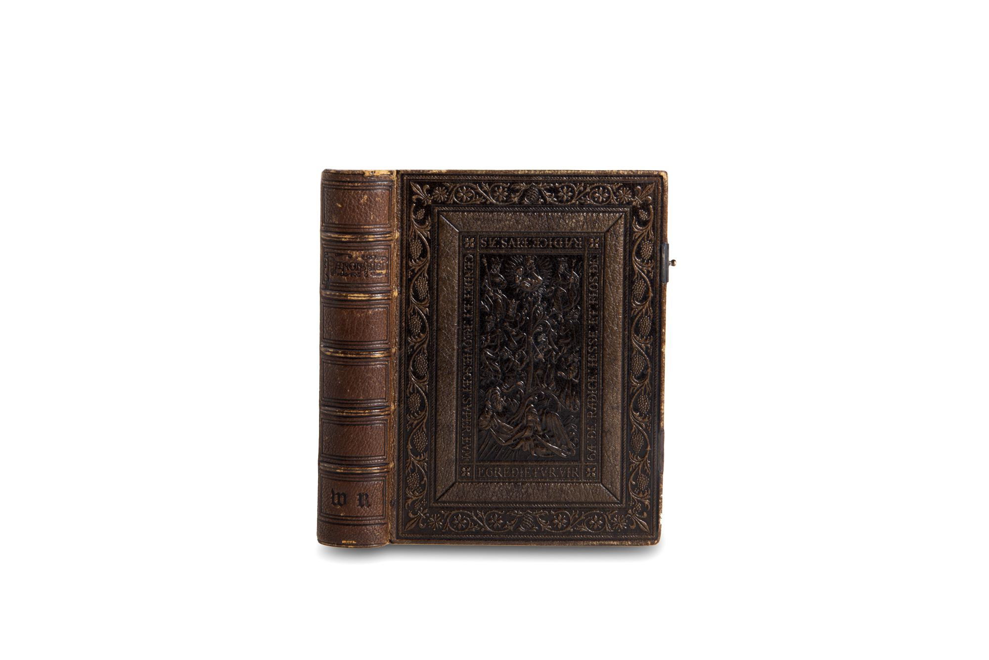Parigi, Benoit, 1858. In 8°.Frontespizio figurato, testo inquadrato da cornice figurata, elegante legatura coeva in marocchino marrone, completamente decorata a secco con figure religiose ed elementi del mondo vegetale, alle sguardie carta dorata decorata con animali in rosso, tracce di fermagli.