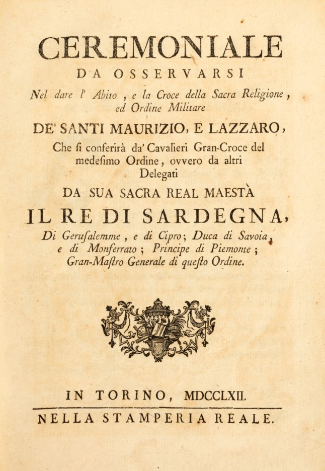 Torino, nella Stamperia Reale, 1762In 8°. Elegante tavola a piena pagina con stemma nobiliare del Regno di Sardegna al frontespizio, fregio, esemplare non completo, bruniture, legatura in marocchino rosso, decorazione impressa in oro, elegante cornice di ferri a conchiglia e motivi floreali, al centro del campo e negli angoli le insegne dei Santi Maurizio e Lazzaro, bruniture.